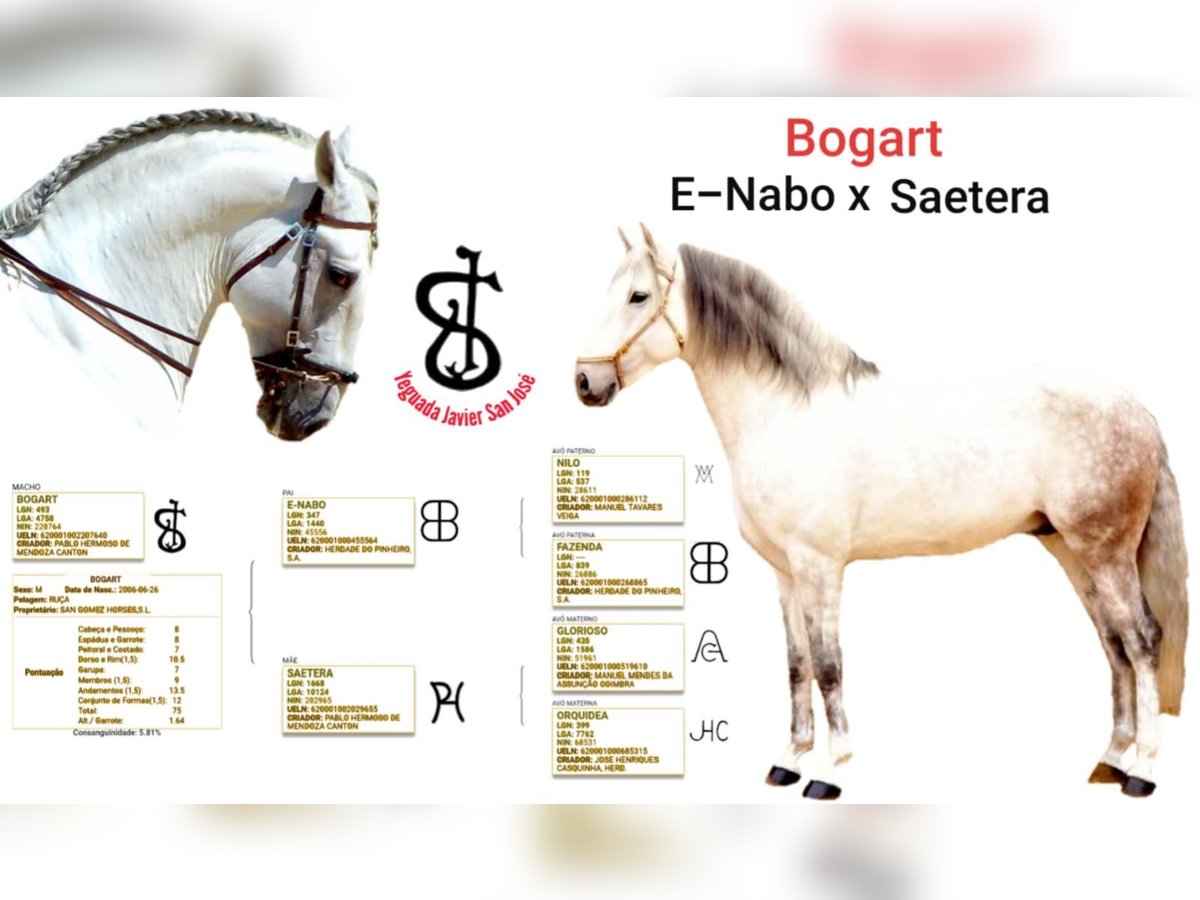 Denna vackra hingst representerar inte bara bästa egenskaper eftersom han är uppfödd av den berömda spanska tjurfäktaren Pablo Hermoso de Mendoza och har en utmärkt stamtavla med blodlinjer från Veiga stud, en av de äldsta och renaste portugisiska dubbarna. Han har extraordinära söner, barnbarn, döttrar och barnbarn. Och på toppen tränas han upp till Grand Prix-nivå med super piaffe, passage, stort trav, piruetter och flygande förändringar. En mycket stark häst, lätt att samla och spektakulära grindar. Bogart ligger på en av de bästa dubbarna för portugisiska hästar i Spanien. Eftersom de redan odlar med nästa generation är denna häst en idealisk utsikt för avel på en ny stud, förbättra blodslinjerna eller starta en stud för Lusitano-hästar. Och på toppen kan han omedelbart startas i dressyrsport på hög nivå. Mycket sällsynt möjlighet!