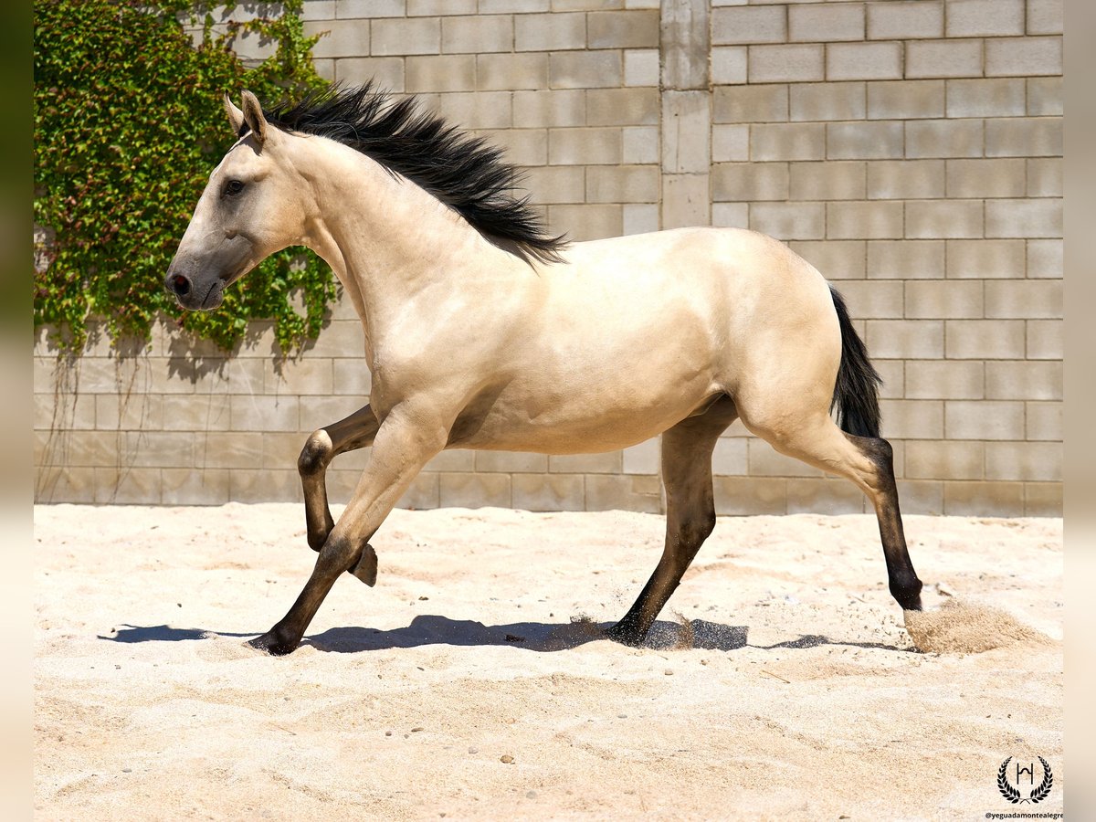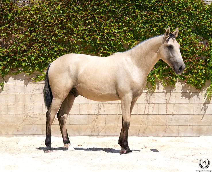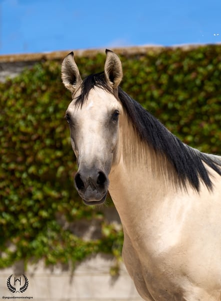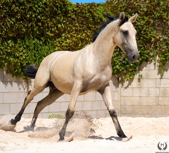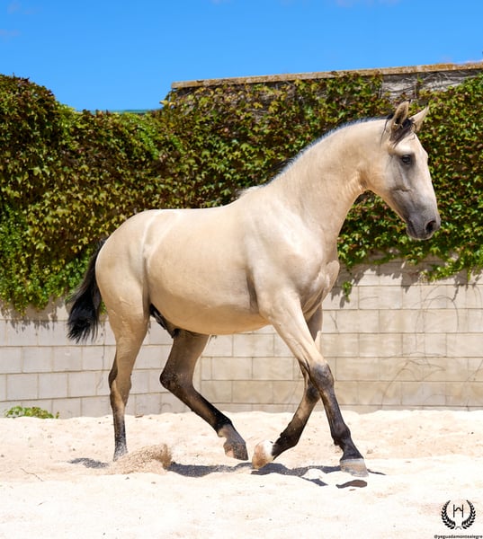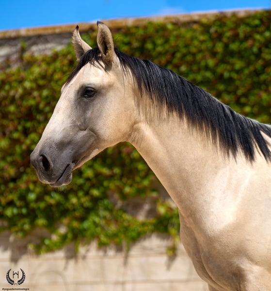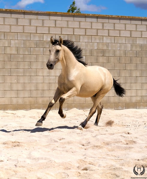 🐴 Uranio is a spectacular Lusitano colt with a very light golden buckskin coat, black points and a white star on his forehead; black mane and tail with a frosted effect. Born on 3 July 2024. Height at the withers: 1.55 m. He stands out for his large frame and baroque, highly breed-typical conformation. Very correct limbs. Sloping shoulders, rounded hindquarters and excellent bone density; convex (ram-nosed) profile, extremely typical of the breed, with very lively and expressive ears and eyes. 💪 With an imposing physique and harmonious, fluid and elastic movement, Uranio combines beauty, nobility and functionality. He will be an ideal young horse for classical dressage as well as for hacking, leisure riding and family enjoyment. 🩺 Health guaranteed: Any veterinary examination accepted. Dewormed, with up-to-date documentation and EU passport. 🔬 Coat genetics: E/x A/a CRcr – Buckskin. 🚛 National and international transport available with specialised companies. 📲 Contact: 🟢 WhatsApp: +34 639 522 420