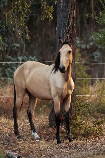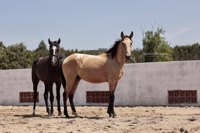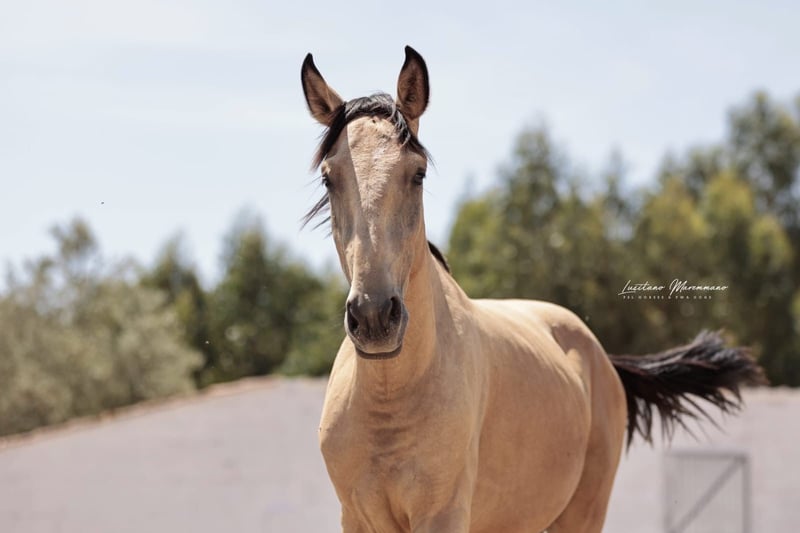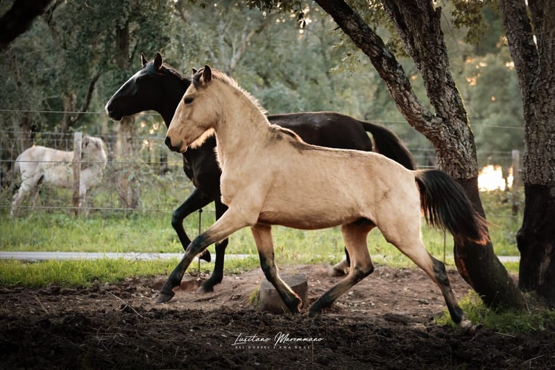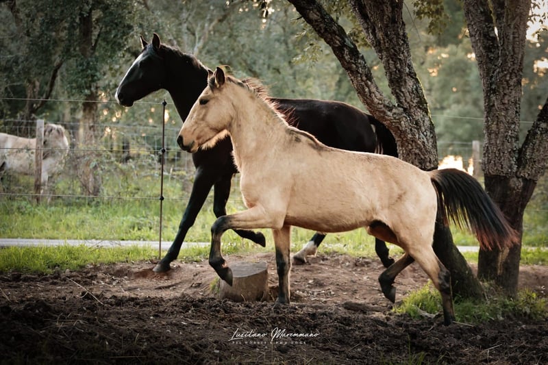Elegant Lusitano young star in a gold coat Characteristics: - Breed: Lusitano - Sex: Stallion - Year of birth: 2023 - Color: dun - Height: 161 cm estimated This young stallion impresses with his elegant appearance and his impressive potential, which he already has as a 1-year-old. He is ideally suited for ambitious riders who are looking for a loyal partner for dressage sport. His sire HERDEIRO DA BROA is licensed with 72 points and his dam with 74.5 points, so I can also see him being used for breeding. His sire can be seen in the last 3 pictures. He is not only golden on the outside, his character is also made of gold. At the moment he lives freely on the campo according to his age and enjoys the time with his buddies. It goes without saying that he is extremely friendly. I can send you more pictures and videos if you are interested.