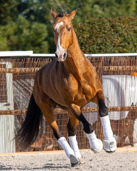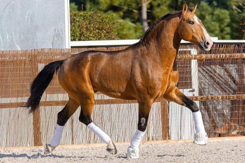 Elegante stella emergente Lusitano in mantello d'oro Caratteristiche: - Razza: Lusitano - Sesso: Stallone - Anno di nascita: 2023 - Colore: Baio - Altezza: 161 cm stimata Questo giovane stallone colpisce per la sua elegante presenza e il suo impressionante potenziale, che già a soli 2 anni dimostra. È particolarmente adatto per cavalieri ambiziosi che cercano un partner fedele per il dressage. Il padre HERDEIRO DA BROA è stato approvato con 72 punti e la madre con 74,5 punti, quindi lo vedo anche per la riproduzione. Il padre è visibile nelle ultime 3 immagini. Non è solo d'oro nell'aspetto, anche il suo carattere è d'oro. Attualmente vive liberamente nel campo, in base alla sua età, e si gode il tempo con i suoi amici. Naturalmente, è estremamente socievole. Posso fornire ulteriori immagini e video su richiesta.