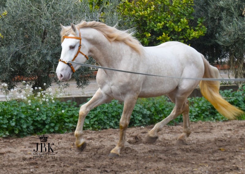 Sultao da Vila was born on April 29, 2022. He is sired by purebred PSL parents; however, his dam was not licensed, so he holds an EU passport but does not have a pedigree certificate. Nevertheless, he is an impressive specimen with all the qualities this breed is known for. I especially want to highlight his excellent, noble character. He is very easy to work with and shows no undesirable behaviors under saddle. He is also completely unhot. After lunging work, he can also be taken for a few rounds around the arena; he remains steady, confident, and absolutely fearless. Currently, he measures 1.65 meters at the withers. His coat color is more of an Isabelle shade, although this is not listed in the categories.