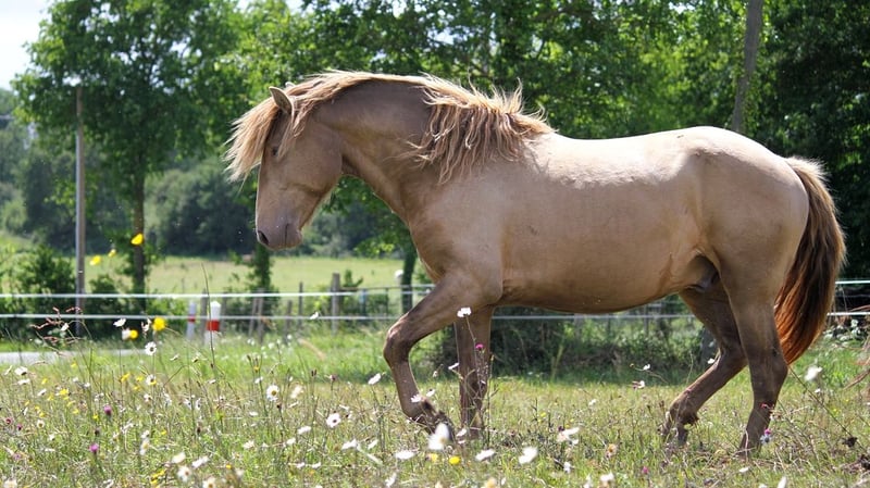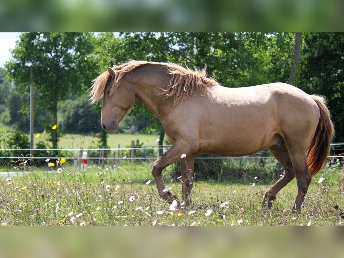 LORYON D’IBERYN – Double Pearl Baroque Stallion Approved Royal Belgium Palomino stallion, 4.5 years old, approximately 16.1 hh, Baroque type. Born in France and registered in the "OC" studbook, sired by two purebred Lusitanian parents, though the sire is not approved for breeding (COCA & LOLYTA). Double Pearl coat – extremely rare. Tested EE Aa PRLPRL, will pass on a black gene and a pearl gene to 100% of his foals. IMPORTANT: He is NOT Lusitanian PP. Approved for breeding by the Royal Belgium Palomino studbook, meaning his offspring will be eligible for RBP registration. GENETICS + HEALTH Negative for all genetic diseases. PRLPRL homozygous – 100% of his foals will carry the pearl gene. EE Aa – 100% bay base, no chestnut foals. No health issues; he has been with me since 8 months old. Never lame or ill. TEMPERAMENT + TRAINING Backed but still green in work (only 4.5 years old), I prefer to take my time. Mainly used for hacking (alone or in groups) and some mountain trail riding. TEMPERAMENT = Cheerful, lively, easy-going, curious, playful, close to humans, calm, zen, willing! He lives outdoors in a herd all year round. Gets along well with both a herd of stallions and a group of mares and foals during the season. Not dominant or aggressive; with other horses, he is rather playful, curious, and relaxed with his companions. He retains a youthful spirit. Already a sire of several foals – respectful of mares and experienced in breeding. UP-TO-DATE Osteopath, dentist, farrier, dewormer, and vaccinated against flu, tetanus, and Rhino. IDEAL FOR = Work riding, dressage, shows, TREC, trail riding, leisure, or breeding.