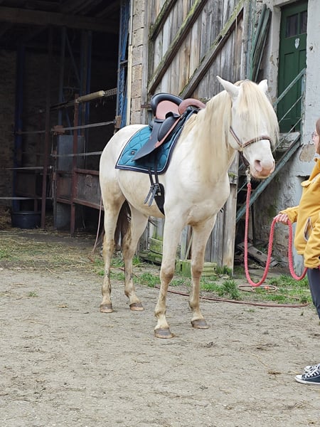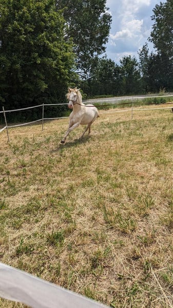 Ecco a voi Louis, registrato come Rexadorex Rex Regulus. E la sua regalità è davvero evidente. Non solo per il suo colore dorato, gli occhi azzurri ghiaccio e la sua postura elegante, ma anche nel suo comportamento. Louis è estremamente affettuoso e desideroso di lavorare, ma non è una palla di sonno. Ha carattere e fuoco, e mostra il suo impegno nel lavoro solo quando si fida del suo cavaliere. Altrimenti può diventare nervoso e preferisce decidere da sé cosa gli sembra giusto in quel momento. L'ho acquistato da puledro e nel corso degli anni sono riuscito a conquistare la sua fiducia, così ora attraversa tranquillamente qualsiasi traffico stradale, viadotti, tunnel e conosce macchinari di ogni dimensione. In addestramento ha bisogno di calma e coerenza; allora affronta qualsiasi sfida con il suo cavaliere. Dopo un grave incidente di escursionismo, la mia mobilità è limitata e non posso essere io a occuparmi di lui a lungo termine, poiché il lavoro a terra da solo gli annoia. È stato addestrato secondo i principi della scuola classica di equitazione accademica, conosce i segnali del cavaliere anche da terra e adora questo tipo di lavoro. Sa eseguire la reinclinazione delle spalle e le manovre di posteriore. Conosce anche il bridon, il cappio e la sella. Tutto ciò non rappresenta alcun problema per lui e aspetta con entusiasmo il prossimo passo nel suo addestramento. Si trova con noi in un branco misto con il mio stallone Friesian e tre gelding; è molto giocoso, ma non rozzo e non è stallone. Si comporta bene passando accanto ad altri cavalli, anche alle femmine. I suoi denti sono regolarmente controllati, così come le vaccinazioni, i trattamenti antiparassitari e le visite dal maniscalco. I suoi zoccoli sono nudi e sono giudicati ottimi dal ferratore. Ora aspetta la sua persona speciale, con la chiave giusta per un re 🙂