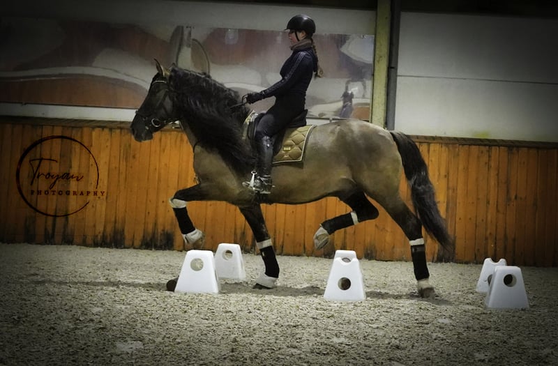 Montañés is born 2018 and showing an enormous talent under the saddle! At his 4 years he is performing all lateral movements with super balance and focus on his work. He is standing 165cm and yet not finished growing. https://youtu.be/yoXdcAt-K2k Montañés is a Lusitano with passport registered in ANCADES stud book. 32 Perfect X -Rays & Piroplasmosis Negative. Extraordinary intelligent and playful young stallion with a promising future under the saddle. If you want to add a bit of special coat to your foals he is the best choice, caring the DUN gene responsible for zebra stripes on legs.