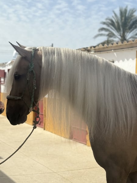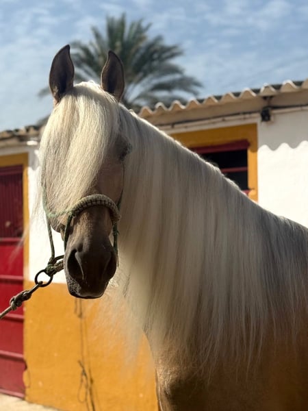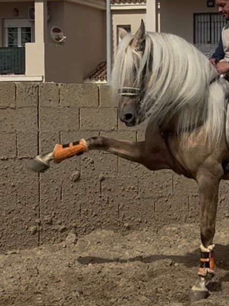 Oro, Lusitano stallion born 2017 and ap. 167 cm. The most beautiful horse! Oro is a stunning stallion with an amazing mentality, he's very kind and sweet to handle and ride. He's well trained and does all lateral exercises, flying changes, Spanish walk and piaffe. Oro often goes out hacking and is used to traffic and different environments, he has no problem to go hacking with a group of horses. Oro is a Lusitano but he has no pedigree in his passport (cruzado). Oro is located in southern Spain and we help with all the steps in the buying process. Read more about us at www.cthorsesales.com Contact: info@cthorsesales.com