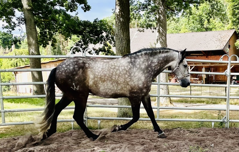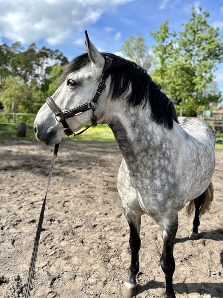 For sale: a stunning Lusitanian gelding – perfect for leisure riding and groundwork! This elegant, apple-gray gelding was born in 2015 and impresses with his charming yet sensitive nature. Due to his sensitive temperament, he is better suited for riders who enjoy hacking and ground work. He can be ridden, but it causes him stress, which he tries to compensate for by increasing his speed. He does not buck or rear. Please note that he is being sold strictly without a trial ride, as he needs to get to know his new person and generally requires trust-building work. Therefore, his price is significantly below market value. He is regularly vaccinated, dewormed, and introduced to the farrier. His teeth are checked every two years, and he is seen by an osteopath once a year.