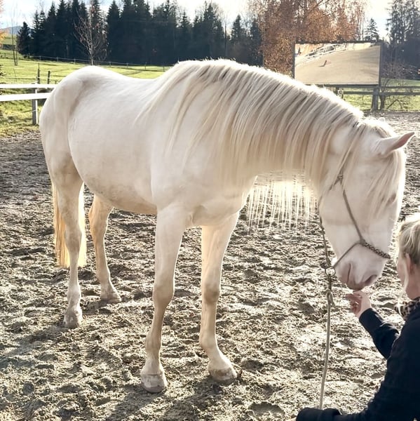 Ein besonderes Pferd, das man nicht sucht – sondern findet. Unser "Jogi" ist ein reinrassiger Pura Sangre Lusitano mit blauen Augen und blauem Buch und stammt aus einer erstklassigen Zucht in Spanien. Mit 3 Jahren vereint er alles, was man sich von einem besonderen Pferd wünscht. Jaguar ist kastriert und ein echtes Gute-Laune-Pferd – freundlich, menschenbezogen und dabei außergewöhnlich klar im Kopf. Seine fröhliche und dennoch ruhige, ausgeglichene Art macht ihn zu einem Partner, dem man sofort vertraut. Lieb im Umgang, völlig unkompliziert, ehrlich im Wesen und mit einer natürlichen Präsenz, die berührt. Aufgewachsen in der Herde, in der freien Natur geboren, durfte Jaguar genau so Pferd sein, wie es für Körper und Seele richtig ist. In der weiten Landschaft der Extremadura in Spanien hat er starke Nerven, gesunde Bewegung und soziale Intelligenz entwickelt – beste Voraussetzungen für ein gesundes, ausgeglichenes und starkes Pferd. Er bringt nicht nur hervorragende Gene mit, sondern auch Charakter, Freude und innere Ruhe. Jaguar ist ein Herzenspferd. 1,5 jährig kam er von Spanien zu uns nach Bayern. Wir haben ihn zusammen mit seinem Halbbruder gekauft, von Anfang an mit der Voraussetzung, dass wir ihn wieder verkaufen, wenn wir seinen Menschen gefunden haben. Bisher haben wir diesen Schritt so gut es geht verdrängt. Er hat nie etwas falsch gemacht, er ist ein wahnsinnig tolles Pferd und wir werden sehr traurig sein, wenn er in sein neues Zuhause umzieht. Bis jetzt ist er mit unseren Jungs mitgesaust, ist sehr sozial und gut verträglich. Er kann alles, was ein 3-jähriger können sollte (longieren, Bodenarbeit, Hänger, Schmied). Er hat super Hufe und läuft Barhuf. Er ist wunderschön, hat eine besondere Aura und seine Mähne wächst täglich! Da wir etwas bekannter sind und nicht unterscheiden können, wer es ernst meint und wer nur einen Sonntagsausflug zu uns machen möchte, verlangen wir eine "Schutzgebühr" von 250€ die beim Kauf wieder angerechnet wird. Gerne schicken wir auch ein Video, das liess sich hier nicht hochladen anschreiben unter Whatsapp 004915228557720! Wir bitten um Dein Verständnis und freuen uns auf Dich!!
