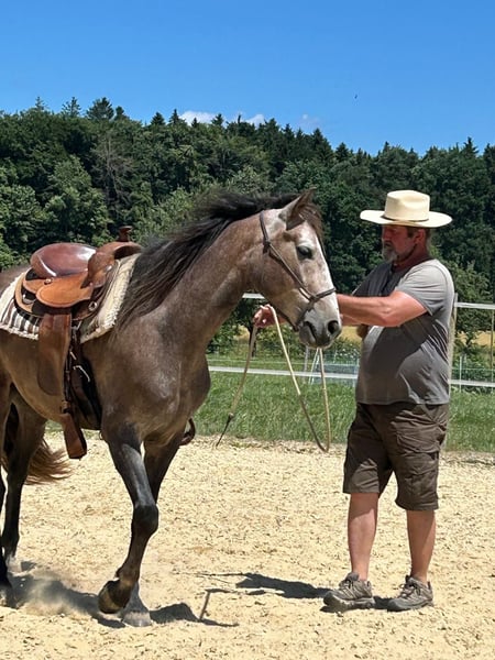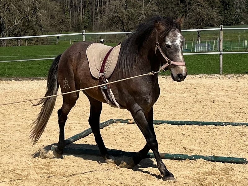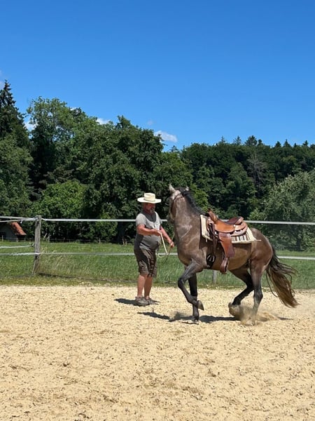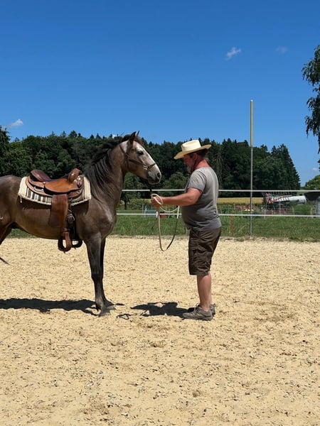 Von Anfang an beeindruckte dieser Lusitano Wallach durch sein aufmerksames und eher vorsichtiges Wesen. Auf der Weide konnte man schnell erkennen für welche Möglichkeiten er geschaffen ist, schnell und wendig, verspielt und freudig, stolz auf sein Vermögen zeigte er den anderen Pferden dass er ein Working Horse ist. Dem Menschen begegnet der Lusitano Wallach sehr respektvoll und lernt schnell, zeigt immer Interesse, lässt sich aber zu nichts zwingen. Der Wallach befindet sich nun im Beritt und wird weitere 3 Monate ausgebildet. Wir sehen in ihm ein grosses Potential, er hat ein wunderschönes korrektes Gebäude und sein Charakter lässt viel offen. Wenn Sie ein vielseitiges Pferd suchen und Freude an Arbeitsreitweisen haben, dann ist Romano sicher der Richtige.