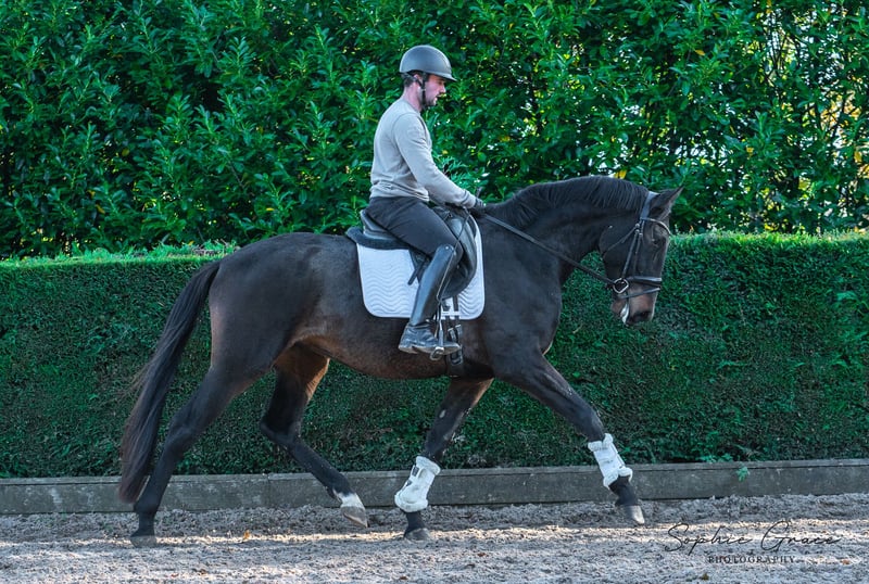 Lusitanien x Hanovrien Superbe hongre de 2 ans avec l'élevage, le mouvement et la conformation pour exceller dans un foyer de dressage. On s'attend à ce qu'il fasse au moins 16,2 h lorsqu'il aura atteint sa pleine maturité. Il a une grande présence audacieuse, mais il est gentil et doux à manipuler. Son père, Equador MVL, n'a plus besoin d'être présenté dans le monde du dressage, ayant concouru à Tokyo aux Jeux Olympiques de 2020. Son attitude concentrée et son mouvement expressif sont évidents et nous sommes sûrs que ce garçon aura hérité de l'aptitude à l'entraînement de la race lusitanienne. Sa mère, issue de la célèbre lignée De Niro, produit actuellement de jeunes chevaux dont les résultats sont très prometteurs. Régulièrement paré et vermifugé, entièrement vacciné. Passeport AES. Disponible à tout moment. Nord-ouest du Royaume-Uni.