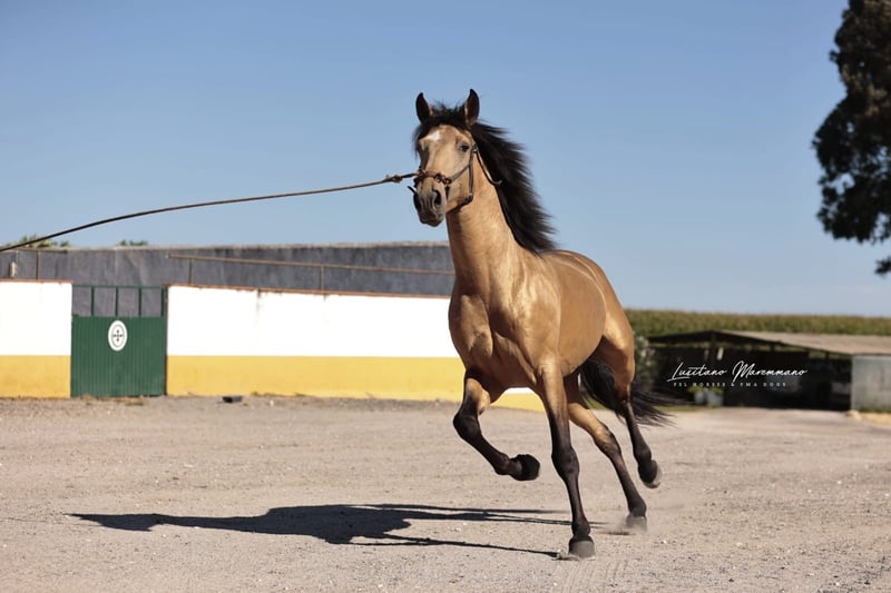 Beautiful PSL gelding in golden buckskin color Features: - Breed: Lusitano - Gender: Gelding - Year of Birth: 2020 - Color: Buckskin - Height: currently 152 cm, will grow a few more centimeters QUIXOTE is a young purebred Lusitano gelding (PSL) who impresses not only with his extraordinary color but also with his honest character and solid foundation. • Age / Height: currently about 1.52 m, final height approximately 1.54–1.55 m • Color: Buckskin – shimmering gold, very striking and noble • Pedigree: o Sire: URANIO (from SOCIEDADE DAS SILVEIRAS) o Dam: JERUPIGA, awarded 70 points • Health: up-to-date vet check without any issues • Training: Basic riding – confidently performs all three basic gaits, always well-behaved, uncomplicated, and with a good work ethic • Character: freshly started, very well-mannered in handling, people-oriented, and pleasantly uncomplicated. He remains calm, friendly, and eager to learn in every situation. QUIXOTE has everything one could wish for in a young Lusitano: excellent pedigree, best health, solid foundation under saddle, and a character that makes him a lifelong partner. His golden exterior completes the overall package. A horse with enormous potential – both for the leisure rider looking for a reliable companion and for riders seeking a special horse with prospects. I would be happy to provide more pictures and videos upon request.