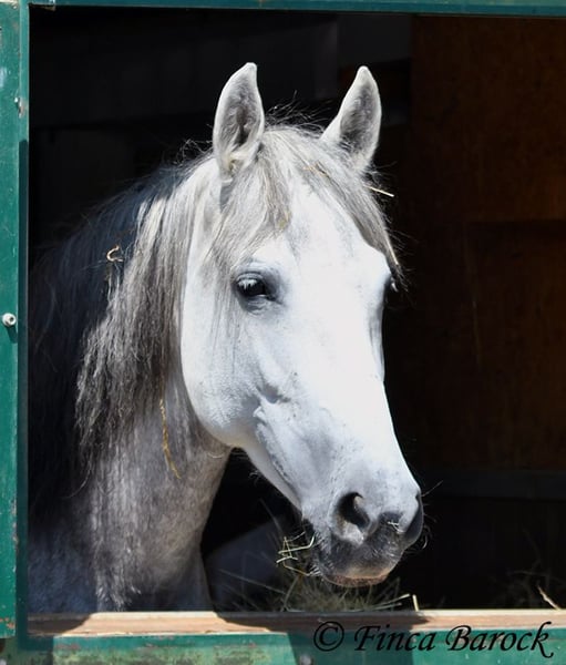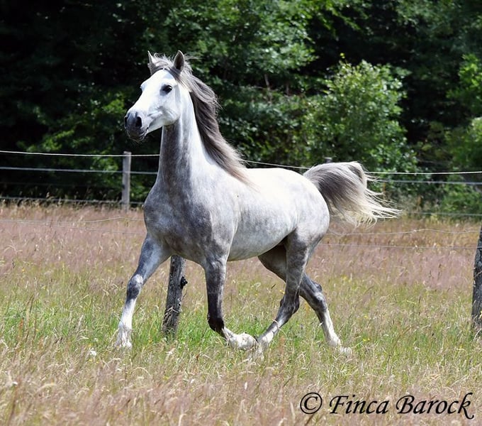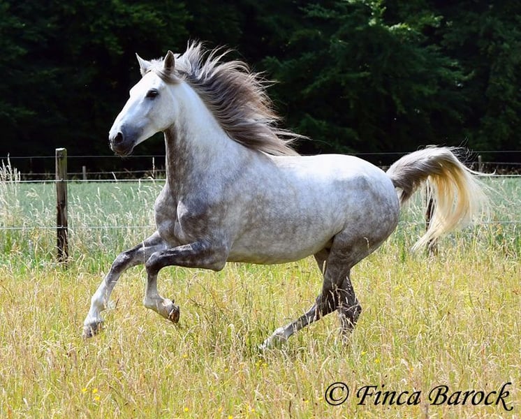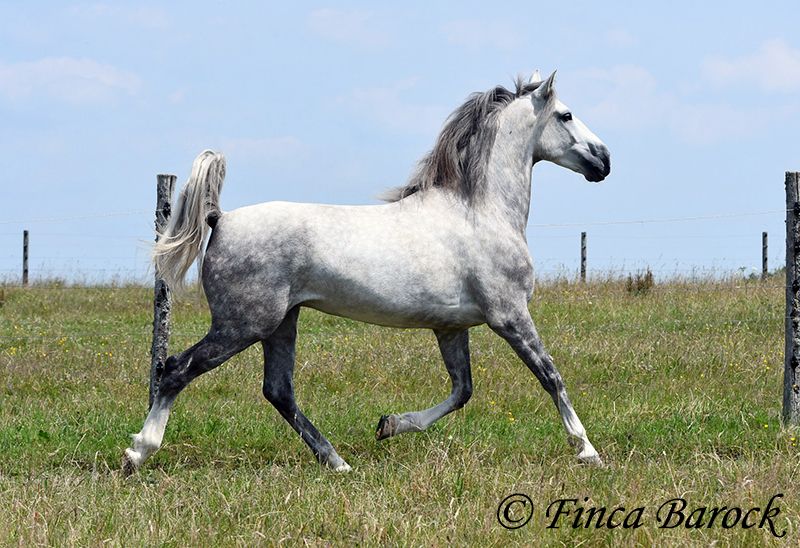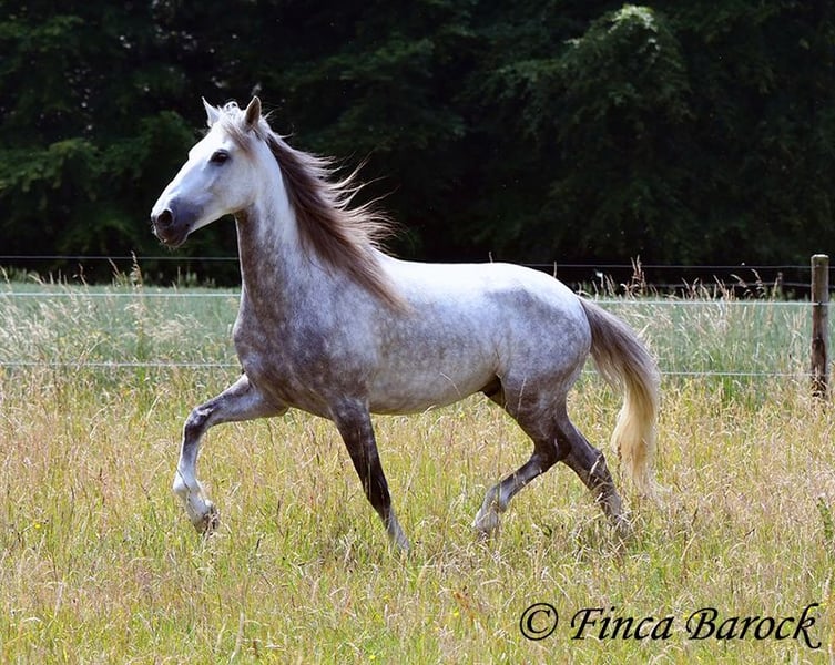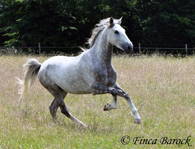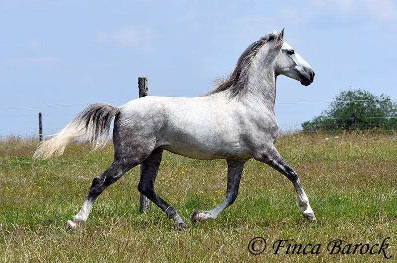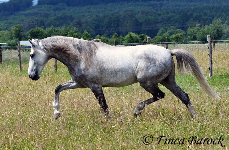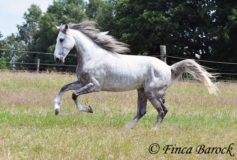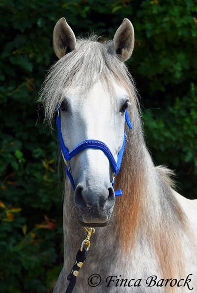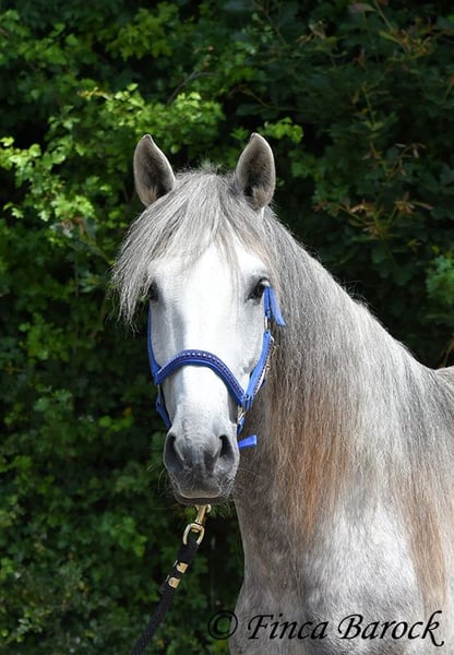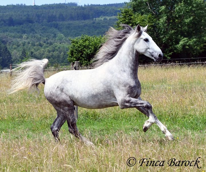 Breed: PSL Name: Quartzo LF Gender: Gelding Height: 16.2 hh Date of Birth: May 29, 2020 Color: Grey (Dun) Price: €14,900 Sire: Atrevido v. Iraque Dam: Doninha II v. Rubi Quartzo is a typy Lusitano with a friendly character and comfortable, balanced movements. He is extremely affectionate and people-oriented. In addition to his good conformation and temperament, he impresses with his rideability and willingness to learn. His uphill canter is particularly remarkable; riding him feels like floating on clouds <3. When faced with unfamiliar situations, Quartzo tends to pause but is easily persuaded to pass by new objects or obstacles. He loves water and enjoys splashing in puddles — a real highlight for him! Currently, Quartzo is in training for walk-trot transitions under saddle. Lateral work such as shoulder-in and travers on the ground already go very well, and he has begun working on travers. From the ground, we are also working on Spanish walk, and he already shows very nice, elevated steps. Overall, we experience Quartzo as a very confident, attentive horse that enjoys new challenges. And that canter... <3 He loves free jumping and hacking out. Overall, he is very versatile — whether work on the lunge, double longe, trail riding as a lead horse, or riding with a partner. Quartzo is sensitive and needs a clear, consistent rider. He is not suitable for beginner riders. He always wants to please and is extremely eager to do everything correctly. If you ask the same lesson three times in the same spot, he quickly anticipates it. A true delight for the refined rider who desires a responsive, clear-headed horse. Quartzo is used to herd life and gets along well with a variety of other horses. Includes veterinary examination and X-rays. Contact: Finca Barock, Tel. 0173-696 31 81, 56291 Wiebelsheim