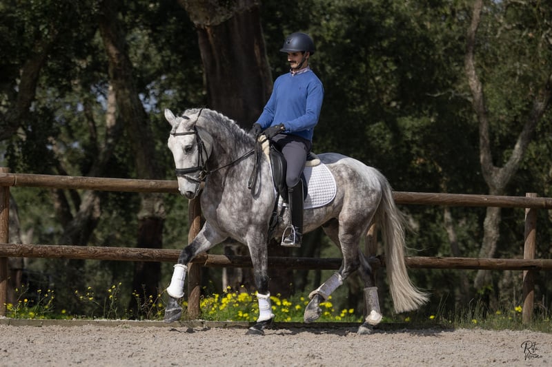 Qing RS (08/2020) 1,64 m piro-frei RX für den Sport zugelassen Qing ist ein talentierter, leichtfüßiger Lusitano-Wallach (PSL), Sohn des Grand Prix-Hengstes Jasmim Plus und mütterlicherseits verbunden mit Quadrado MAC (Coimbra). Er verfügt über drei überdurchschnittliche Gangarten: einen außergewöhnlich guten Schritt, einen leichten, schwebenden Trab mit schöner Schulterfreiheit und starkem Hinterbein sowie eine sehr ausgeglichene Galoppade. Aufgewachsen in Belgien. Gepflegt und gut erzogen. Ein sehr anhängliches und liebenswertes Pferd. Die letzten sechs Monate befindet er sich in professionellem Training in Portugal, wo er für den Verkauf vorbereitet wird. Ausbildungsstand: Seitwärtsarbeit, Kontragalopp, erste fliegende Wechsel. Er ist auch mit Bodenarbeit (TRT-Methode), Longieren und Handarbeit vertraut. Er kommt gut mit anderen Pferden aus. Im Umgang ist er sehr brav und gut erzogen. Qing gehört in eine höhere Preisklasse (>25.000 €) und ist in Portugal zu besichtigen.