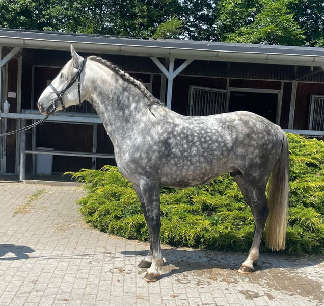Opus HR, a Lusitano of fine lineage bred in Germany. Born 06.2018. Raised in a species-appropriate manner (only turned out this year), year-round pasture, in the company of a gelding on 1.2 hectares. Naturally with an open stable, top-quality hay, and mineral feed. Started under saddle at 5, and training has continued this year. He shows himself to be very well-behaved and hardworking under saddle. Learns quickly and brings joy. Also cool in the terrain. Opus trusts humans and is easily convinced when faced with new challenges. In free movement, he shows himself to be very agile and jumps changes very smoothly. The very well-angled hindquarters make this easy for him. Gradually, this advantage is also becoming evident under saddle. He handles every new challenge well. He has never been sick, not even a cough. Regular deworming, vaccinations, and hoof care should go without saying. Unfortunately, this wonderful horse is too small for me. For questions and if interested, please feel free to call. Videos available upon request.