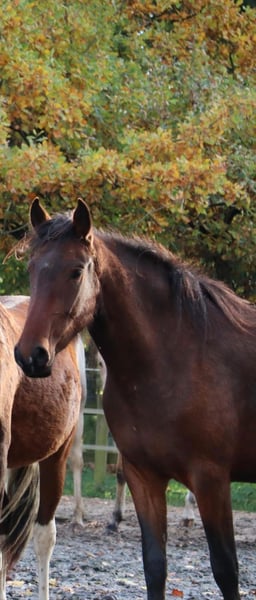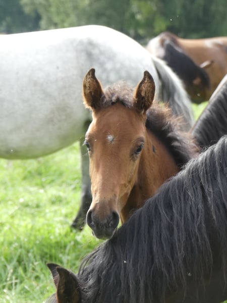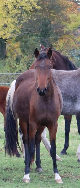 Afra is a very attractive, well-muscled young chestnut mare with a confident demeanor and plenty of presence. She is human-oriented and has been raised appropriately for her age (halter-trained, able to be trimmed, and accustomed to being tied up, though not for extended periods yet). Her gait tendencies include Marcha Batida and Marcha Picada, and she demonstrates a remarkably good canter for a gaited horse. It can be safely said that she requires loving yet consistent further training to become a wonderful partner for all situations, "thick and thin." I have not listed her for sale until now, as I intended to keep her for further breeding. However, I ultimately have to accept that I need to reduce my horse herd due to age and especially health reasons. This is also why there are only a few photos of her from 2024 and 2025.