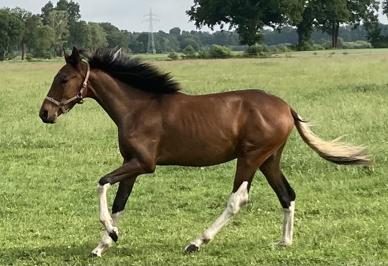 Espresso vom Hartungshof, born on April 20, 2025, is a stunning dark bay gelding with minimal white markings. He is very affectionate and curious, and has already learned the basics of handling young horses (halter training, leading, being tied up – currently only for short periods). He is familiar with hoof handling and trimming. He possesses excellent basic gaits, a very correct conformation, and his natural gait tendencies include Marcha Batida and Marcha Picada. Additionally, he has a well-sprung gallop for a gaited horse. Espresso lives in a herd of 20 horses ranging from 6 months to 29 years old. The older horses contribute valuable educational work, while the younger ones enjoy their leisure time. His final height is expected to be between 150 and 155 cm at the withers.