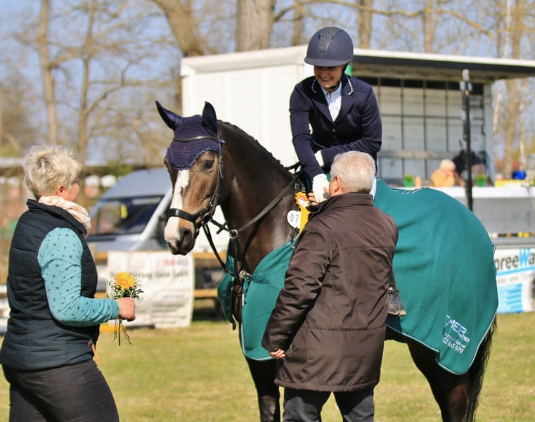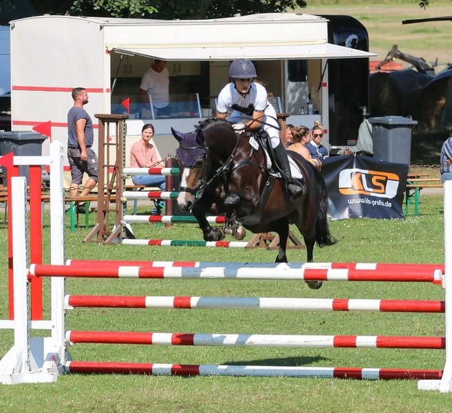 Ciaco's Carun (Rufnahme Cia) ist eine 10-Jährige Stute von Ciaco's Son S x Ciacomini. Sie ist seit ihrem 2. Lebensjahr in meinem Besitz. Cia ist eine dunkelbraune schmale Stute und 1.62 m groß. Daher ideal für Jugendliche und kleine Erwachsene. Cia ist in den Sparten Springen, Dressur und Gelände bis A Niveau ausgebildet. Auch wenn ihre Stärke definitiv im Springen liegt, meistert sie die anderen Disziplinen auch mit Bravour. Sie ist mit mir bis Springpferde L auf dem Turnier gelaufen, bis A** Dressur und bis A* Gelände. Zudem könnte ich mir Cia als Kinderpony vorstellen. Sie hat bereits ein 8 Jähriges Kind brav durch den Reiterwettbewerb getragen und ein 14 Jähriges Mädchen durch ihr Reitabzeichen. Auch wenn Cia sehr brav ist, wäre es zu empfehlen, dass sie regelmäßig Korrektur geritten bzw. von einem Erwachsenen mitbetreut wird. Zur Zeit wird sie wegen fehlender Zeit meinerseits überwiegend von einem 17-jährigen Mädchen geritten. Die beiden konnten in ihrer ersten gemeinsamen Turniersaison bereits Schleifchen im E-Gelände, E-Springen und A-Springen erreiten. Cia hat mehrfach an einem Showprogramm beim Tag der offenen Tür teilgenommen und dort nicht nur bei der Tagesveranstaltung, sondern auch bei Nacht überzeugen können. Fuchsjagden und Übernachtungsturniere, sowie Kurzurlaube mit Pferd sind für Cia kein Problem. Ihre Erfolge der letzten Jahre können auf Rimondo nachgesehen werden. Videos auf Anfrage. Cia wird aus persönlichen Gründen verkauft. Ich werde ihr aktuell und vermutlich auch in den nächsten Jahren nicht gerecht. Sie ist eine unglaublich tolle Lehrmeisterin und eine 12/10 im Umgang (schmiede- und verladefromm, kennt Hunde, Trecker, Hühner, Kindergeburstage). Beim Ausreiten hat Cia sehr viel Go und ist nur von einem erfahrenen Reiter zu reiten. In meiner Traumvorstellung finde ich für Cia ein neues Zuhause, in dem sie Kindern von klein auf den Turniereinstieg ermöglicht. Es wäre schön, wenn Cia 24/7 draußen stehen könnte, oder nur nachts in der Box gehalten wird. Platz vor Preis! Bei ernsthaften Interesse schreiben Sie mir gern eine WhatsApp (015252839979) um einen Termin telefonisch zu vereinbaren. Es wird eine Gebühr von 25 Euro für das Probereiten erhoben, die bei Kauf verrechnet wird. Eine AKU kann natürlich veranlasst werden, diese muss aber selbst gezahlt werden.