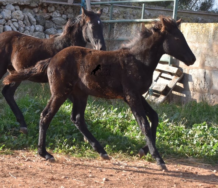 Born in the summer of 2024, this purebred Menorquin mare with full paper is a very cute young lady. She is completely black with no white markings and her dad is a multiple award winner for his awards in the local Doma Menorquina. Her paternal grandfather is one of the 3 elite stallions of the breed, with a lot of knee action, which has also come through in her. She is very compact and her expected final height is around 157cm. She is weaned together with her foal friend and is familiar with both the robust stall and the box. She is halter-trained and as her passport has already been issued, she is ready to move to her forever home. For today's steadily increasing price range of the Menorquin, she is also very affordable ;) If you want to get her later, a breeding place can be organized for her. Videos and pedigree on request. Her location is Menorca. I would be happy to organize a foal AKU on site, transport or even your trip, should you come to see her in person. Details can be found on my website or in conversation. Saludos from Spain