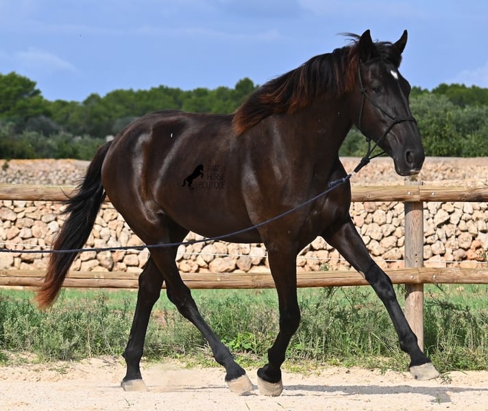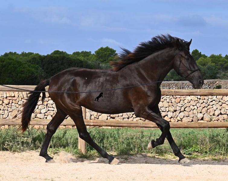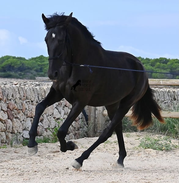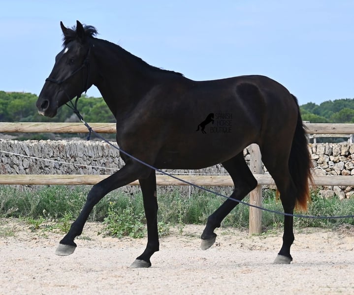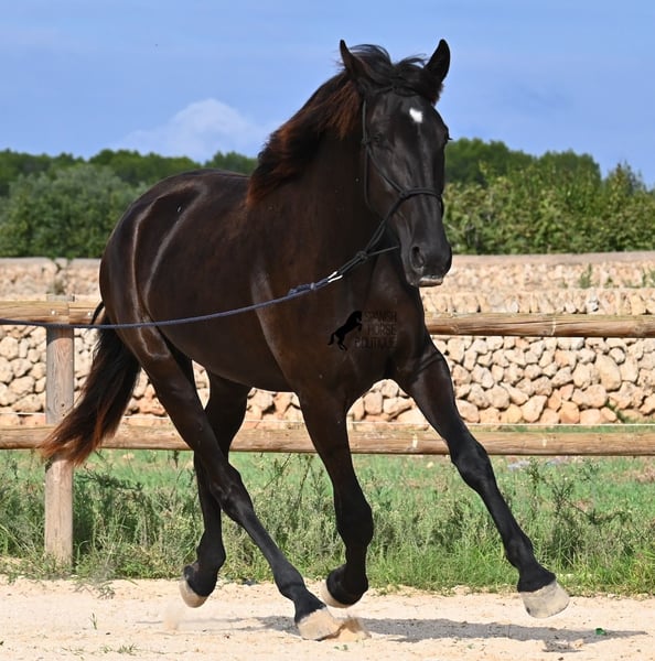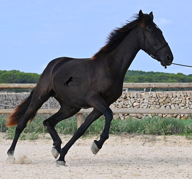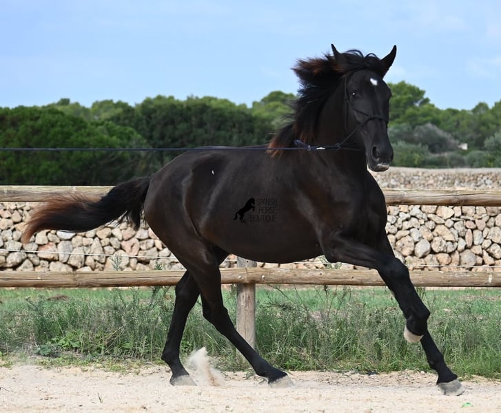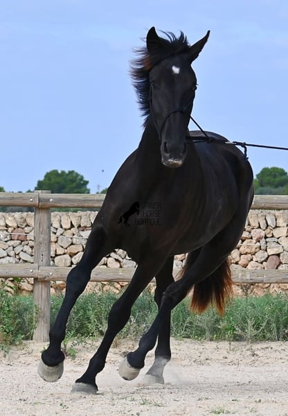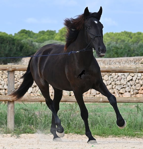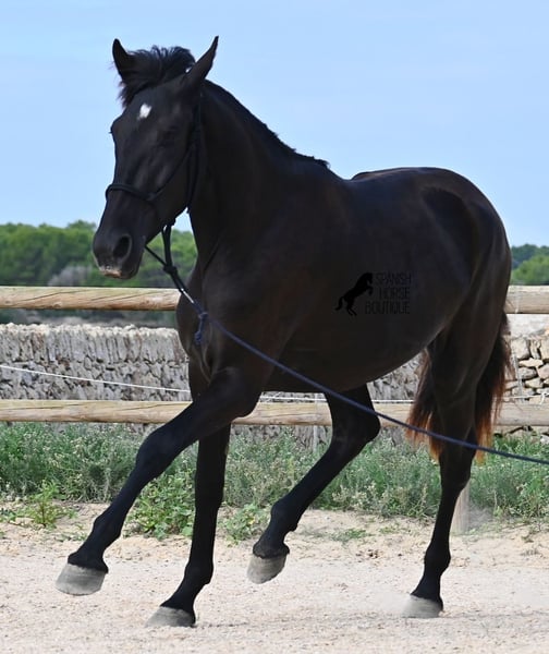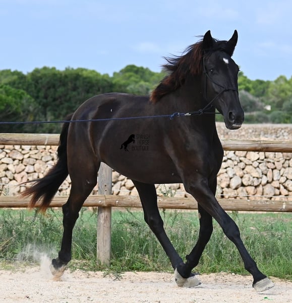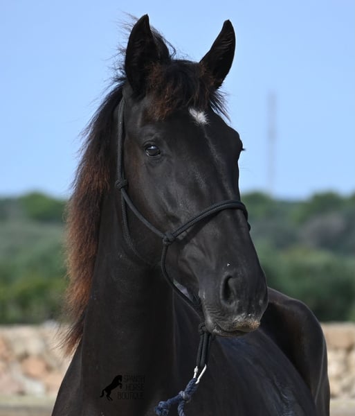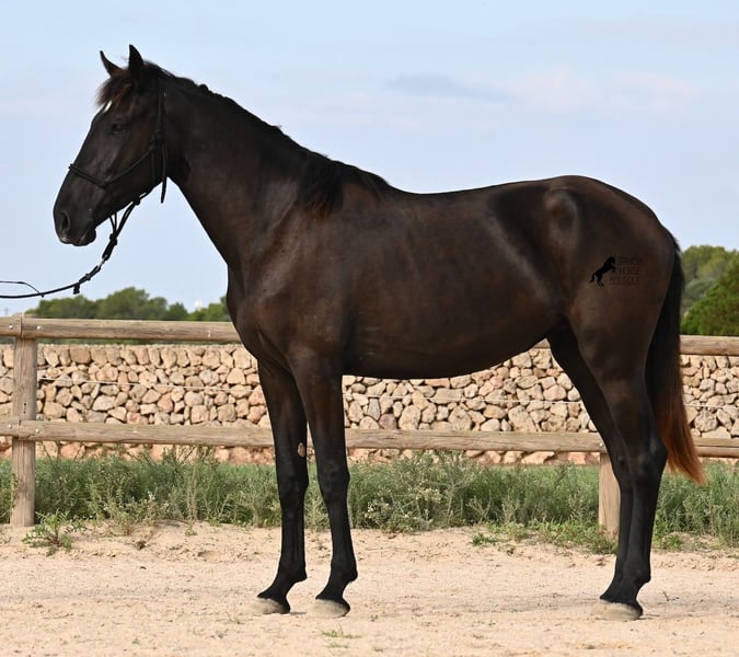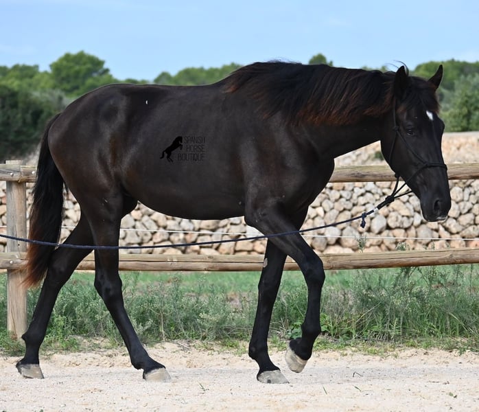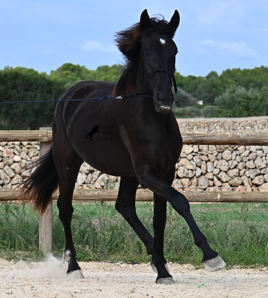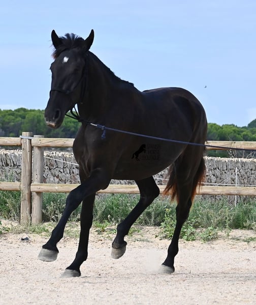 This purebred Menorquin mare, born in 2023, definitely aims high! Currently, she already measures 162 cm and will grow even more. She comes from very old lines of the Menorquin, although her father, at over 170 cm, belongs to the modern type. Her long legs know how to move, as she trots very balanced and has a good posture in the canter. Thus, she will later be interesting for many disciplines as a riding horse, especially for those who like larger horses. The star on her forehead makes her stand out from the crowd and shines as clearly as her eye. The young lady is very well-mannered and is already familiar with lunging in a halter, aside from daily handling; otherwise, she is naturally untrained due to her age. She lives in a herd and, thanks to the rough climate and rocky soils, has hard hooves and clear legs. She has "beautified" her muzzle with sand, but underneath, she is completely black. Her final height will definitely be over 165 cm. Videos and pedigree available upon request. Her location is Menorca. I would be happy to organize a foal vet check, transport, or her journey if you wish to come and see her in person. Details can be found on my page or in conversation. Greetings from Spain!