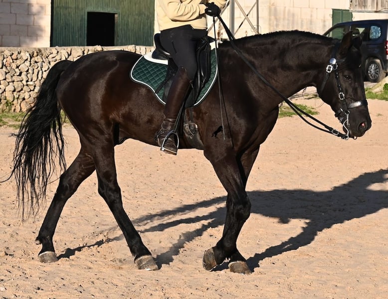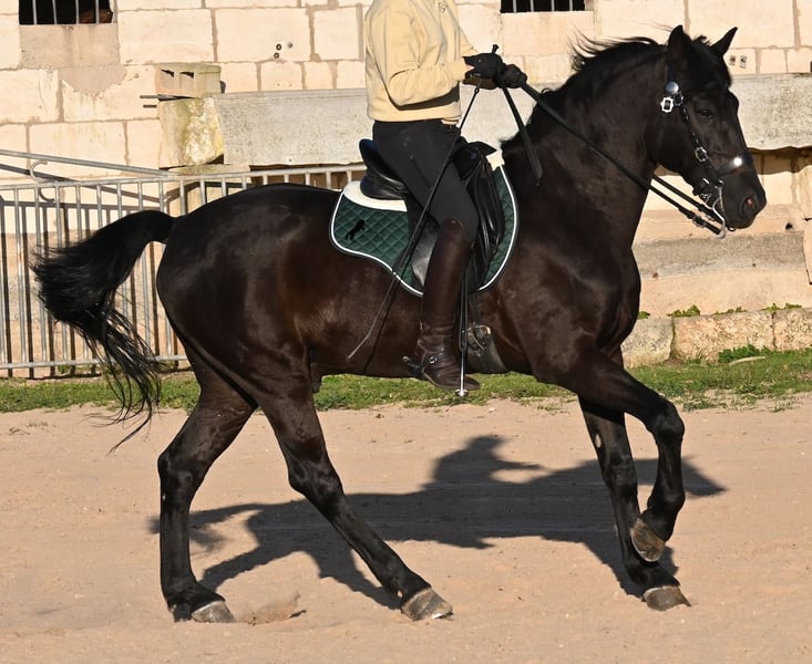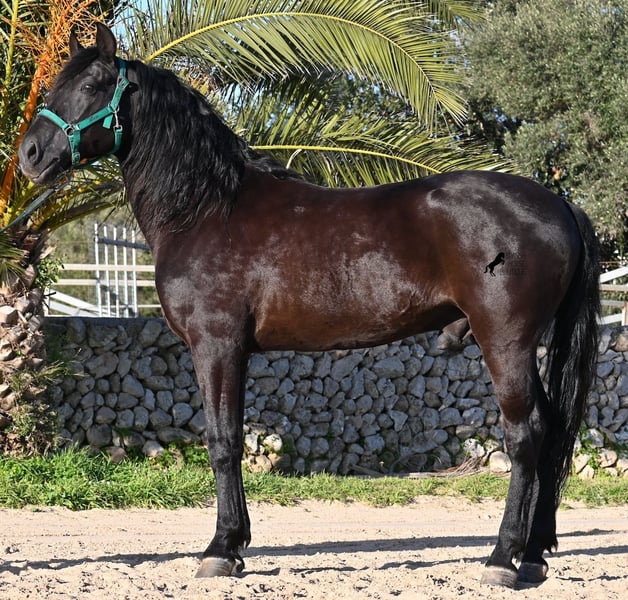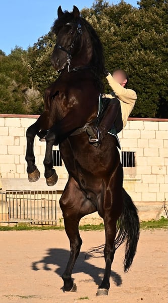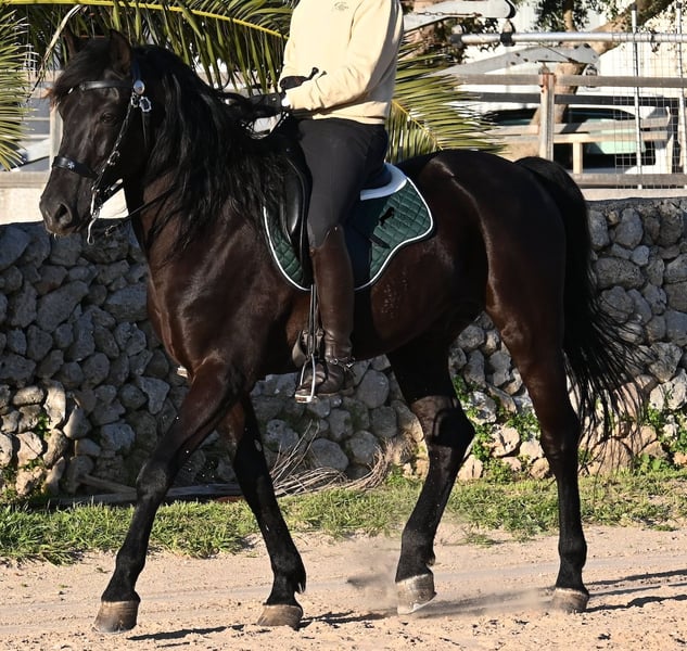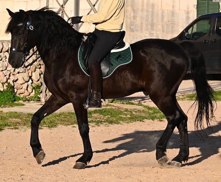 Dieser 2014 geborene, reinrassige Menorquinhengst, hat so einiges zu bieten! Er ist in jeder Situation absolut sicher und im Gelände klettert er über felsige Abschnitte, in stoischer Ruhe. An der Hand ist er sehr brav und immer aufmerksam bei seinem Menschen. Geritten ist er in der örtlichen typischen Doma Menorquina (Einhändig), sowie klassisch englisch. Ihn bringt wirklich nichts aus der Ruhe, denn er hat sowohl Showerfahrung, wo er mehrfach in einer Hengstquadrille aufgetreten ist und mehrfache Fiestaerfahrung. Kurzum, ein bombensicheres Pferd! Unterm Sattel beherrscht er laterale Lektionen, den spanischen Schritt und den typischen BOT der Menorquin (Laufen auf der Hinterhand)- doch keine Sorge, wer das nicht mag, er macht es nur auf Abruf und nicht als "Überraschung". Sein Charakter ist sehr ruhig und das merkt man auch beim Reiten. Jede Woche geht es mindestens einmal ins Gelände, alleine oder mit Anhängerfahrt zu einem stundenlangen Gruppenausritt! Er ist also verladefromm und geländesicher auf allen Untergründen, alleine sowie in der Gruppe. Seine schöne, barocke Halsung und die natürliche Welle in der Mähne, stechen sofort ins Auge. Seine Schönheit hat er schon mehrfach unter Beweis stellen dürfen, denn auch modeln für internationale Fotografen, gehört zu seinem Repertoire. Auch da ist er an der Hand über Felsen geklettert, um an gute Spots zu kommen, ist stoisch gestanden ohne Gezappel und eines der Bilder von ihm hat sogar einen internationalen Fotowettbewerb gewonnen. In einem Menorquinkalender 2026 ist er auch vertreten (Bestellung vom Kalender über mich möglich!). Abstammen tut er ganz alter Urlinien des Menorquin und diese Pferde zeichnen sich durch ihre Ausdauer, ihren Mut und ihre Treue aus- alles Punkte die er auf jeden Fall erfüllt. Er ist 166cm, gekört und hat keine weißen Abzeichen, wie es das Zuchtziel wünscht. Die Abendsonne lässt ihn etwas heller erscheinen, aber er ist definitiv ein Rappe, wie es ein Menorquin sein soll. Wer keinen Hengst halten kann/möchte, für den besteht selbstverständlich die Option der Kastration vor Ort. Es wurden 01/2026 Röntgen von ihm gemacht, die gerne zur Verfügung gestellt werden. Ein wahres Juwel an Pferd mit gutem Charakter und auch Showpotenzial. Preis der Qualität entsprechend! Sein Standort ist Menorca. Videos und Abstammung gerne auf Anfrage. Gerne organisiere ich vor Ort eine AKU, Beritt, Kastration, Transport oder auch ihre Reise, sollten Sie persönlich zum Anschauen kommen. Details dazu gerne auf meiner Seite oder im Gespräch. Saludos aus Spanien