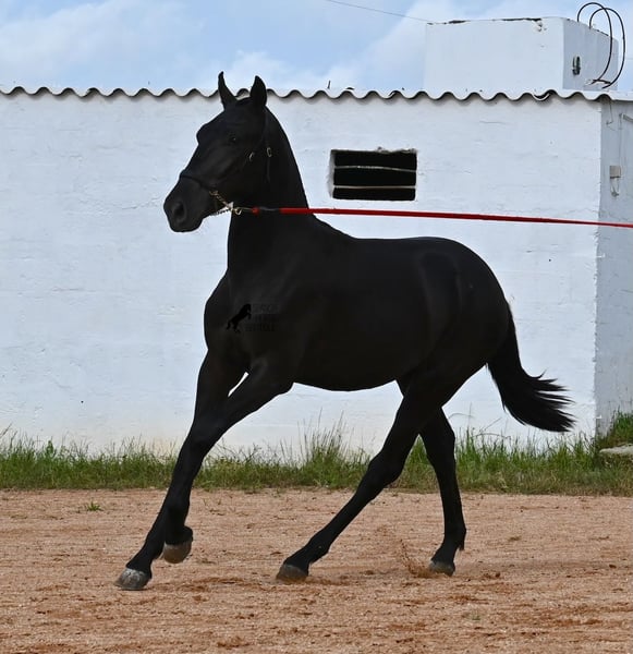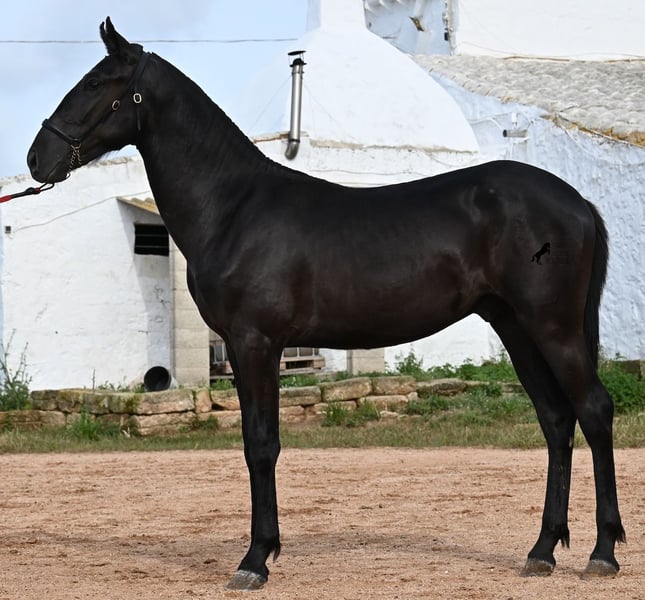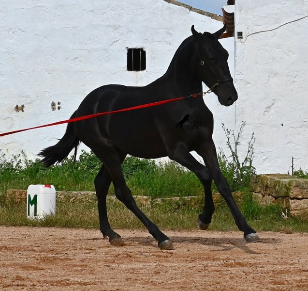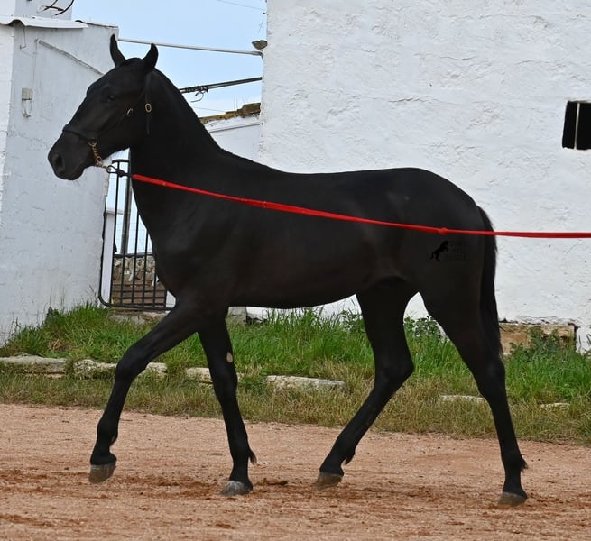 This purebred Menorquin stallion, born in spring 2024, is an absolute gem. As is typical for Menorquins, he is kept in a herd with 24-hour robust housing, and thanks to the rough climate and rocky terrain, he has good hoof quality, clean legs, and is as sure-footed as a mountain goat. ;) Noble blood flows through his veins, as his father has produced several breed champions, and on his mother's side, his grandfather is a Recomendado stallion, renowned for his excellent dressage performance. The young man is curious and is simply allowed to enjoy the horse life in the foal kindergarten. He knows how to be lunged in a halter and enjoys grooming, but is otherwise untrained. Later, he will be interesting both as a riding horse and as a driving horse, as Menorquins are very versatile! His expected final height is around 160 cm. Aside from some barely visible, isolated tick hairs on his head (which can hardly be called a star), he is completely black. If you wish to pick him up later, a breeding place can be organized for him. Videos and pedigree are available upon request. His location is Menorca. I would be happy to arrange a foal veterinary check, transport, or your trip if you wish to come and see him in person. Details can be found on my page or in conversation. Greetings from Spain!