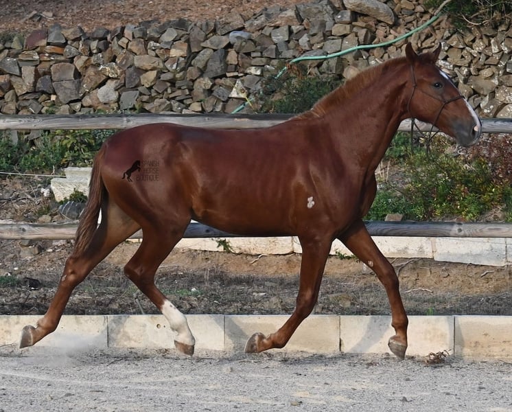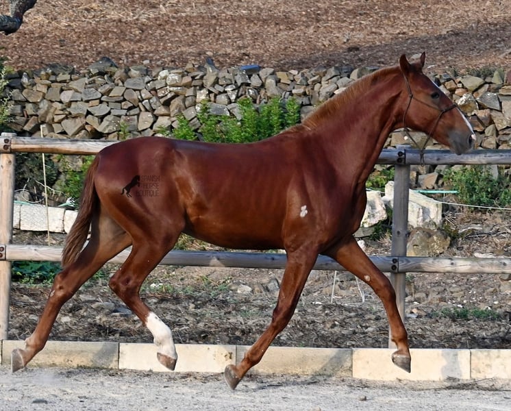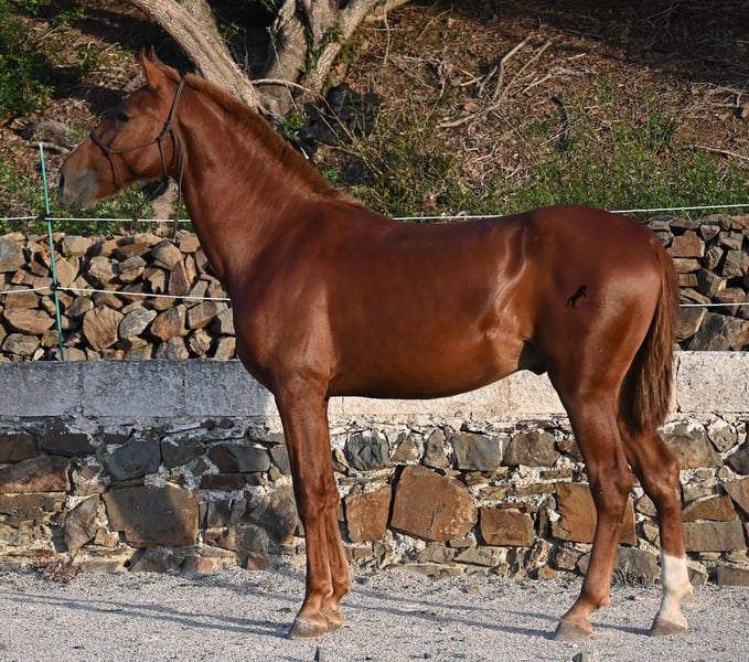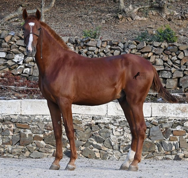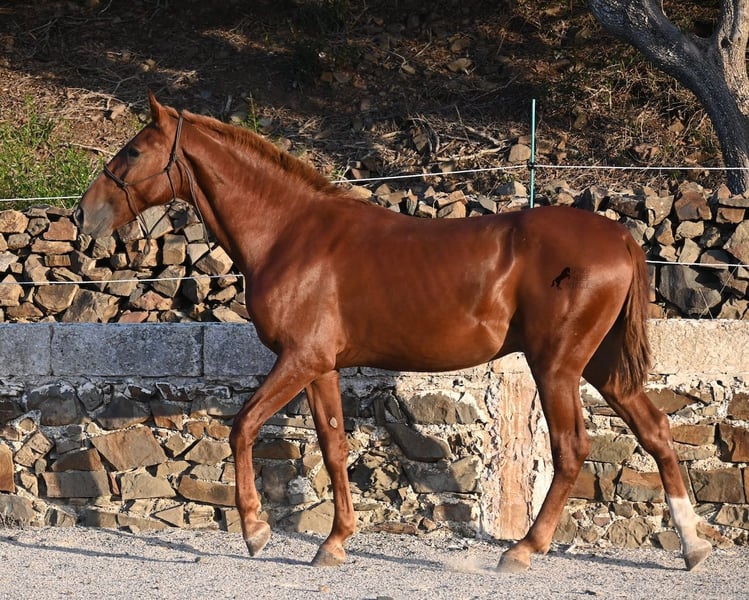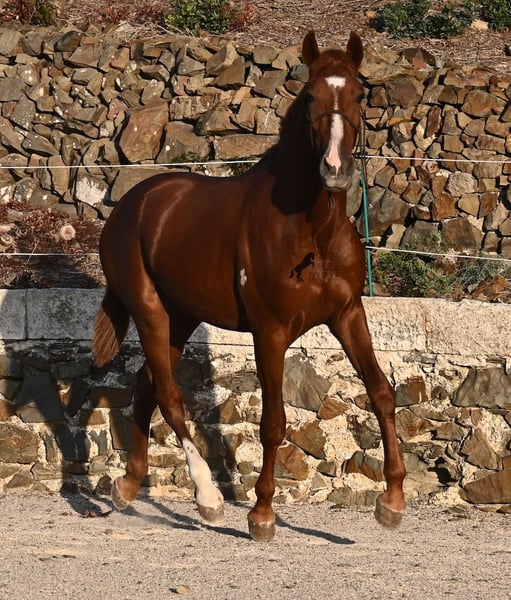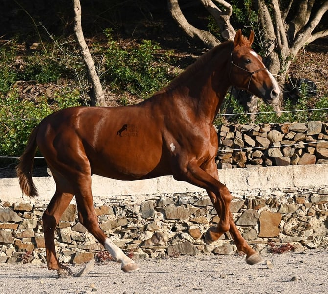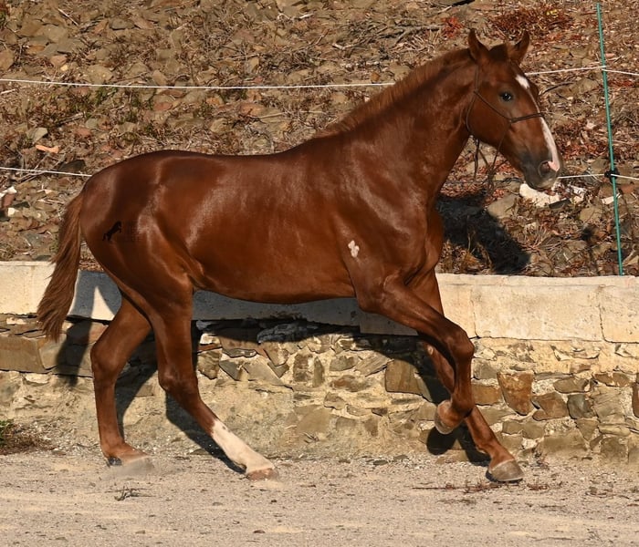 A Menorquin is already a very exclusive horse, as they are endangered. It is very rare for Menorquins to be born in chestnut color, which are considered lucky charms. However, this 2024-born Menorquin stallion is even more extraordinary and unique, as he also has a blaze, one white sock, and a white mark on his right shoulder. So if you are looking for an unmistakable horse that is unmatched in uniqueness, then this chestnut jewel is the end of your search :) The young horse descends from old and original lines of the Menorquin, known for their resilience and endurance. He has the typical movements desired locally for the fiestas. Not very expansive but sofa-comfortable in all gaits! In handling, he is very well-behaved, though still a bit shy, as the horses from this breeder grow up in a robust environment on many hectares of land. He would surely appreciate a forever home where he can learn even more and have contact with people. Not long ago, the breeding association decided that the "red" Menorquins would also be recognized by the association, provided they are purebred. Thus, the young horse also has the original Menorquin papers and his entry in the studbook, but only black specimens are allowed for breeding. His expected final height is around 164 cm. Videos and pedigree available upon request! His location is Menorca. I would be happy to organize a foal inspection, transport, or your trip should you wish to come and see him in person. Details can be found on my page or in conversation. Greetings from Spain!