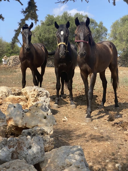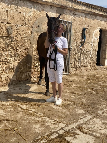 🌟 Dieser äußerst knappe Hengst ist bereit für den nächsten Schritt Dieser besondere Hengst steht an einem Wendepunkt in seiner Karriere. Wir haben ihn gekauft, als er ein Jahr alt war. Danach verbrachte er ein weiteres Jahr auf Menorca, wo er in einer natürlichen Umgebung aufwachsen konnte. Der Untergrund dort spielt eine wichtige Rolle bei der Entwicklung starker Hufe und Sehnen – eine wertvolle Basis für die Zukunft. Anschließend stand er zwei Jahre in den Niederlanden bei seinem Kumpel aus Menorca, zusammen mit einem weiteren spanischen Hengst. In dieser Zeit sammelte er bereits viele positive Erfahrungen: Er war im Wald unterwegs, spazierte an der Hauptstraße, wurde longiert, lernte die ersten Grundzüge der spanischen Gangart und wurde bereits eingeritten. Daher wird das Anreiten voraussichtlich ruhig und entspannt verlaufen. Auch im Transporter zeigt er sich brav: Er läuft ruhig hinein und steht ordentlich während des Transports. Im Mai 2024 ist er bei uns eingezogen, um weiter heranzuwachsen – schließlich sind es oft die Spätentwickler. Er läuft in einer Gruppe von neun Pferden (KWPN) und hat dort von Anfang an mühelos seinen Platz gefunden. Er geht viel mit der Leitstute mit, spielt gerne mit den anderen Hengsten und ist auffallend lieb und vorsichtig gegenüber den Fohlen. Er kann rund um die Uhr draußen stehen, ist aber auch daran gewöhnt, nachts im Stall zu verbringen. Er ist sozial, ausgeglichen und fühlt sich in einer Gruppe wohl. 💛 Was wir uns für ihn wünschen Wir wünschen ihm einen liebevollen, engagierten Platz, an dem er wirklich ein Partner für jemanden sein darf. Ein Ort mit gutem Management und einer ruhigen, positiven Trainingsmethode. Er würde perfekt zu jemandem passen, der Abwechslung liebt: * Bodenarbeit * Ausritte im Gelände * Working Equitation * Dressur Das Wichtigste für uns ist, dass er an einem 5-Sterne-Platz landet, wo er mit Aufmerksamkeit und Freude weiter wachsen kann. Möchten Sie mehr über diesen besonderen Hengst erfahren? Der Menorquín Der Menorquín ist eine Pferderasse, die von der Baleareninsel Menorca in Spanien stammt. Beschreibung Es ist ein stolzes Barockpferd mit tiefschwarzem Fell und üppigem, prachtvollem Mähne- und Schweifwuchs. Fohlen werden braun geboren und verfärben sich später schwarz. Abzeichen sind innerhalb der Rasse unerwünscht. Die Rasse ist bekannt für ihre elegante Erscheinung, ruhiges Temperament und gehorsamen Charakter. Die Pferde verfügen über geschmeidige, rhythmische Gänge und verbinden Anmut mit Kraft. Zudem sind sie robust, widerstandsfähig und können ein hohes Alter erreichen – manchmal bis zu vierzig Jahren. Verwendung Der Menorquín glänzt in der Höchstschul- dressur. Bei traditionellen religiösen Prozessionen auf Menorca zeigen sie ihre beeindruckenden Künste in den Straßen, wo sie vom Publikum bewundert werden. Bei den sogenannten Jaleo-Festen stehen und laufen die Pferde oft längere Zeit auf den Hinterbeinen. Aufgrund ihrer natürlichen Veranlagung für diese spektakulären Bewegungen, darunter die Courbette, benötigen sie einen erfahrenen und ausgeglichenen Reiter. Auf Menorca wurde sogar eine eigene Form der klassischen Reitkunst entwickelt: die Doma menorquina. Zucht Lange Zeit wurde der Menorquín als eine Unterart des Andalusiers betrachtet. Zu den Vorfahren dieser iberischen Pferde gehören unter anderem Berber, Araber und Lusitanos. Ein verwandtes Rasse auf Mallorca ist der Balearen-Pony (Caballo mallorquín). 1989 wurde das eigene Zuchtbuch unter dem Namen Caballo de Pura Raza Menorquina gegründet. Die Rasse zählt derzeit etwa 2.500 registrierte Pferde und verzeichnet eine steigende Population. Der Export von Menorquíns erfolgt nur in begrenztem Umfang, unter anderem nach Deutschland.