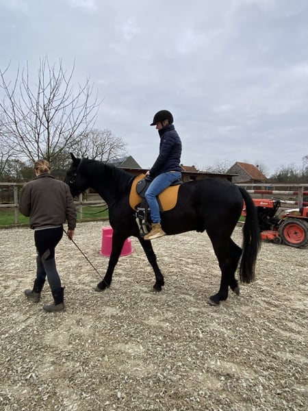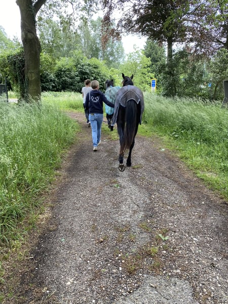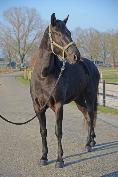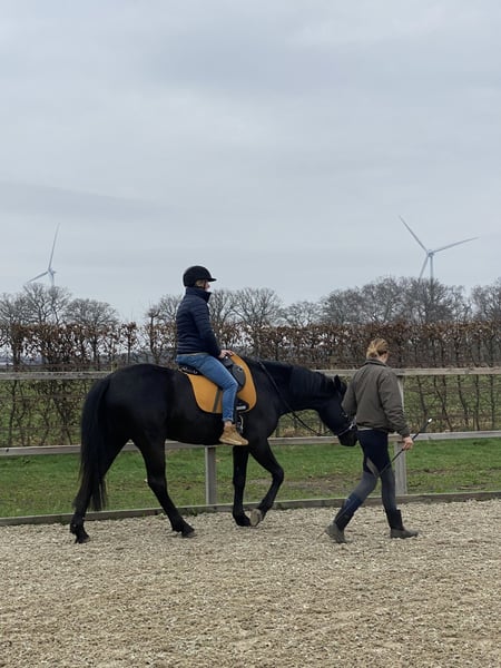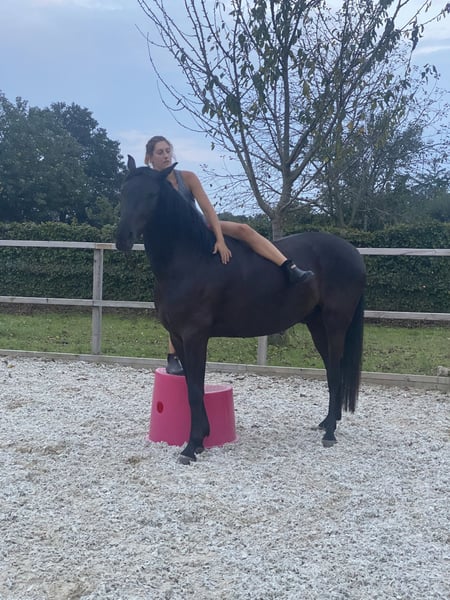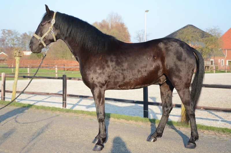 🌟 Deze super knappe ruin is klaar voor zijn volgende stap Deze bijzondere ruin is toe aan een nieuwe fase in zijn carrière. Wij hebben hem gekocht toen hij één jaar oud was. Daarna is hij nog een jaar op Menorca gebleven, waar hij in een natuurlijke omgeving kon opgroeien. De ondergrond daar speelt een belangrijke rol in het ontwikkelen van sterke hoeven en pezen – een waardevolle basis voor de toekomst. Vervolgens heeft hij twee jaar in Nederland gestaan bij zijn maatje uit Menorca, samen met nog een Spaanse ruin. In die periode heeft hij al veel positieve ervaringen opgedaan: hij is mee geweest naar het bos, heeft gewandeld langs de grote weg, is gelongeerd, heeft de eerste beginselen van de Spaanse pas geleerd en heeft al zadel opgehad. Hierdoor zal hij het zadelmak maken naar verwachting vlot en ontspannen doorlopen. Ook in de vrachtwagen is hij braaf: hij loopt er rustig op en staat netjes tijdens transport. In mei 2024 is hij bij ons thuis gekomen, waar hij de tijd heeft gekregen om verder uit te groeien – het zijn tenslotte laatbloeiers. Hij loopt in een groep van negen paarden (KWPN) en heeft daar vanaf dag één moeiteloos zijn plek gevonden. Hij trekt veel op met de leidende merrie, speelt graag met de andere ruinen en is opvallend lief en voorzichtig naar de veulens. Hij kan 24/7 buiten staan, maar is ook gewend om ’s nachts op stal te staan. Hij is sociaal, stabiel en voelt zich prettig in een groep. 💛 Wat wij voor hem zoeken Wij gunnen hem een fijne, betrokken plek waar hij echt een maatje voor iemand mag zijn. Een plek met goed management en een rustige, positieve manier van trainen. Hij zou perfect passen bij iemand die houdt van afwisseling: * grondwerk * buitenritten * Working Equitation * dressuur Het allerbelangrijkste voor ons is dat hij op een 5⭐️-plek terechtkomt, waar hij met aandacht en plezier verder mag groeien. Wil je meer weten over deze bijzondere paarden? De Menorquín De Menorquín is een paardenras afkomstig van het Baleareneiland Menorca in Spanje. Beschrijving Het is een fier barokpaard met een diepzwarte vacht en een rijke, weelderige manen- en staartgroei. Veulens worden bruin geboren en verkleuren later naar zwart. Aftekeningen zijn binnen het ras niet gewenst. Het ras staat bekend om zijn elegante uitstraling, rustige temperament en gehoorzame karakter. De paarden beschikken over soepele, ritmische gangen en combineren sierlijkheid met kracht. Daarnaast zijn ze sober, robuust en kunnen zij een hoge leeftijd bereiken – soms tot wel veertig jaar. Gebruik De Menorquín blinkt uit in de hogeschooldressuur. Tijdens traditionele religieuze processies op Menorca tonen zij hun indrukwekkende kunsten in de straten, waar zij door het publiek bewonderd worden. Bij de zogeheten Jaleo-feesten staan en lopen de paarden vaak langdurig op de achterbenen. Door hun natuurlijke aanleg voor deze spectaculaire bewegingen, waaronder de courbette, vragen zij om een ervaren en evenwichtige ruiter. Op Menorca is zelfs een eigen vorm van klassieke rijkunst ontwikkeld: de Doma menorquina. Fokkerij Lange tijd werd de Menorquín beschouwd als een subtype van de Andalusiër. Tot de voorouders van deze Iberische paarden behoren onder andere de Berber, de Arabier en de Lusitano. Een verwant ras op Mallorca is de Balearenpony (Caballo mallorquín). In 1989 werd het eigen stamboek opgericht onder de naam Caballo de Pura Raza Menorquina. Het ras telt momenteel ongeveer 2.500 geregistreerde paarden en vertoont een stijgende populatie. Op beperkte schaal worden Menorquíns geëxporteerd, onder andere naar Nederland.