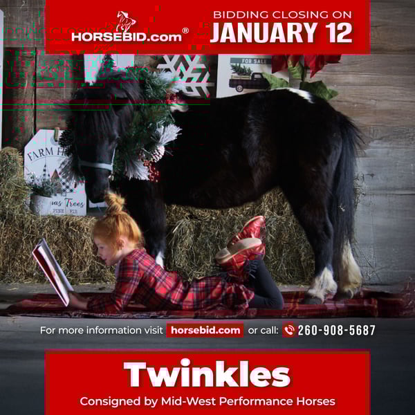 ♦️𝐍𝐄𝐖 𝐘𝐄𝐀𝐑'𝐒 𝑬𝒙𝒕𝒓𝒂𝒗𝒂𝒈𝒂𝒏𝒛𝒂♦️ Happening now thru MONDAY | JANUARY 12th - Available EXCLUSIVELY on HorseBid's website! For more details and to register visit: www.Horsebid.com CONSIGNOR CONTACT: Mid-West Performance Horses 260-908-5687 LOCATION: Saint Joe, IN BREED: Mini REGISTERED: No REGISTERED NAME: Twinkles COLOR: Paint HEIGHT: 33 inches AGE: 10 GENDER: Mare 𝘛𝘸𝘪𝘯𝘬𝘭𝘦𝘴 • 2015 Paint Pony Mare • 33 inches Twinkles is a gorgeous ten-year-old paint mini pony mare who is ready to make someone’s Christmas absolutely unforgettable. She is the kind of pony every family dreams of—sweet, dependable, and incredibly kid-friendly. Whether she’s hitched to a cart or saddled for a ride, Twinkles brings joy, confidence, and a whole lot of holiday magic to every child she meets. This little mare is broke to ride and drive, making her a versatile partner for young cowboys and cowgirls. She has been up and down main highways and through town, proving herself traffic safe and sound every single time. Kids can easily catch her out in the pasture, and she loves the attention. She has no bad habits, stays gentle, and is always willing to please. Twinkles has great, solid feet and has never foundered. She handles every type of trail with ease—sure-footed, steady, and always looking after her little rider. Whether your child wants to explore woods, fields, creeks, or quiet roads, Twinkles will take care of them from start to finish. She truly makes trail riding safe, fun, and unforgettable. Saddling and hitching this little mare is a breeze. Twinkles has excellent stall manners, fantastic ground manners, and she’s an easy keeper through and through. She turns out well with mares, geldings, horses, and ponies, and she’s used to cows, dogs, and all sorts of farm life. She has even been around heavy machinery without batting an eye. A calmer, steadier mini pony is hard to find. Twinkles will stand tied all day long and loves being groomed and pampered. She is the perfect size, the perfect color, and the perfect temperament for a child wanting their first real partner. She truly would make a magnificent Christmas gift for any little cowboy or cowgirl looking for a trustworthy pony to love and grow with. Midwest Performance Horses can provide holiday-season shipping to ensure this special little package arrives safely and on time for your family. For questions, videos, or to schedule a visit, please contact April with Midwest Performance Horses. Wishing you and your family a warm and blessed holiday season! Mid-West Performance Horses - Saint Joe, Indiana - 260-908-5687