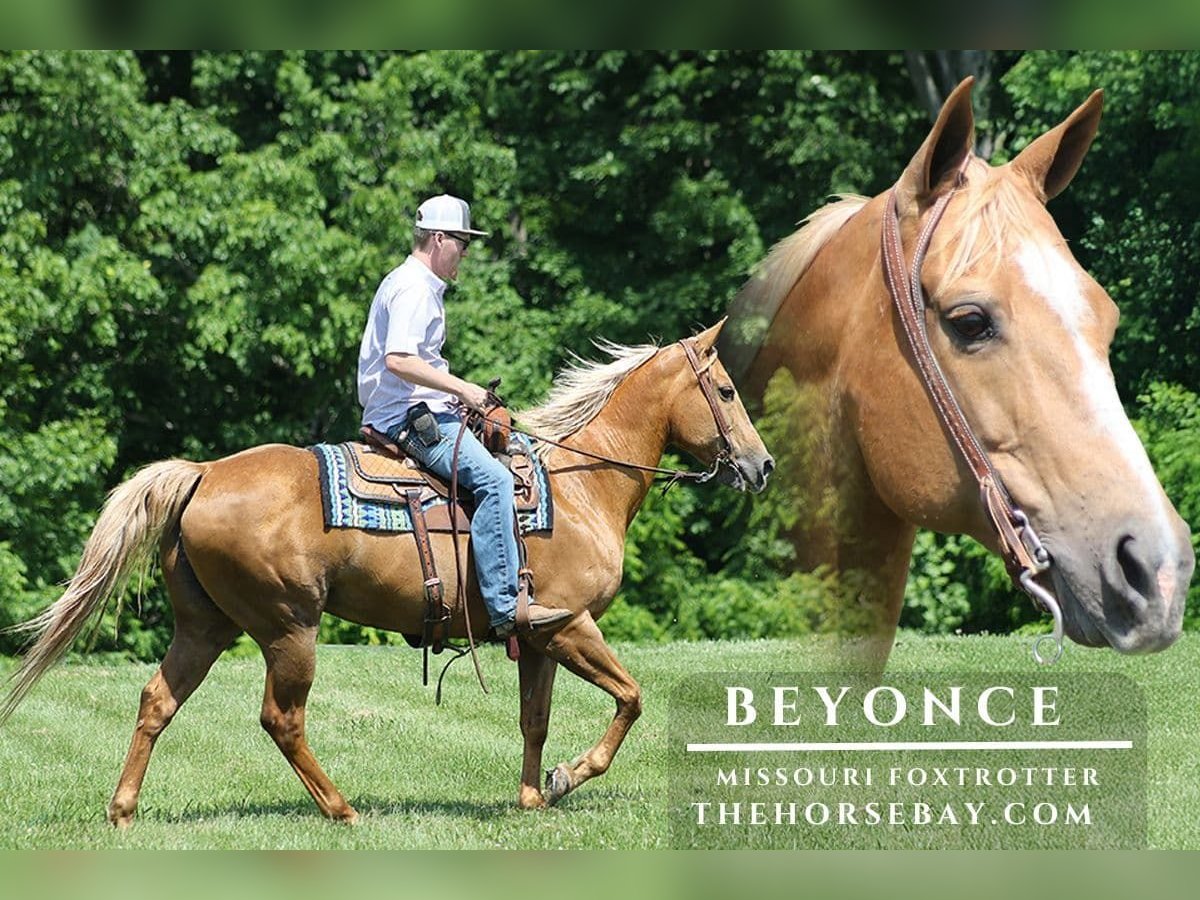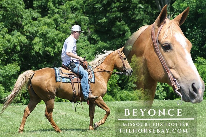 Take a look at this beautiful, well-built lady… she lives up to her name of Beyonce! I proudly introduce Beyoncé; she is a stout-built, 15.1-hands-tall, 11-year-old, Golden Palomino Missouri Foxtrotting Mare. Beyoncé has spent most of her life riding trails, and she is safe for anyone to trail ride. She has been on camping trips and day rides all over Illinois, Missouri, Tennessee, and Kentucky. She has a smooth-as-glass foxtrotting gait that anyone will love! Beyonce has more woe-than-go and in-your-pocket type attitude. She is what everyone strives for when looking for a riding partner, and if that isn’t enough, she is easy on the eyes as well. If you are looking for a beautiful/easy-to-ride trail horse…look no further.