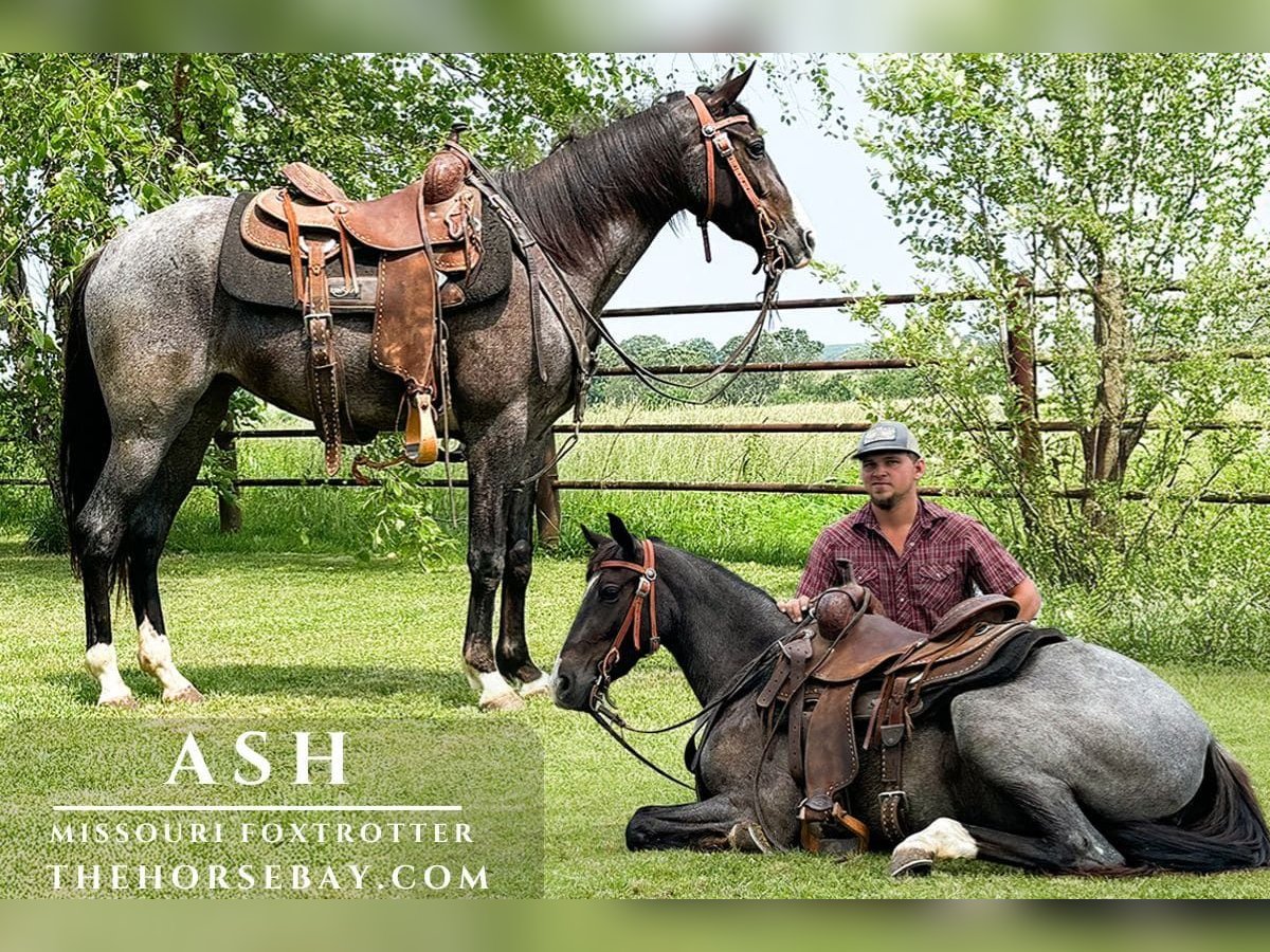 Ash to 3-letnia, wkrótce 4-letnia niebieska roan Fox Trotter. Ash ma jedną z najsłodszych osobowości, jakie można znaleźć! Jest bardzo łatwa do złapania i zawsze pragnie być kochana. Jeździłem na Ash przez wiele mil szlakami i zabrałem ją na nocne wyprawy campingowe. Ash ma bardzo gładki czterotaktowy chód i ładny galop. Wsiada i zsiada perfekcyjnie i ma bardzo łagodny charakter. Prawie każdy może jeździć na niej z pewnością siebie. Cofnie się i dobrze reaguje na wodze na szyi, a także może jeździć samodzielnie lub z innymi. Nie ma żadnych złych nawyków. Ash potrafi również leżeć! To bardzo fajny koń, który będzie towarzyszył komuś przez całe życie. Ash ma 14,2 ręki i prawdopodobnie osiągnie 15 rąk.