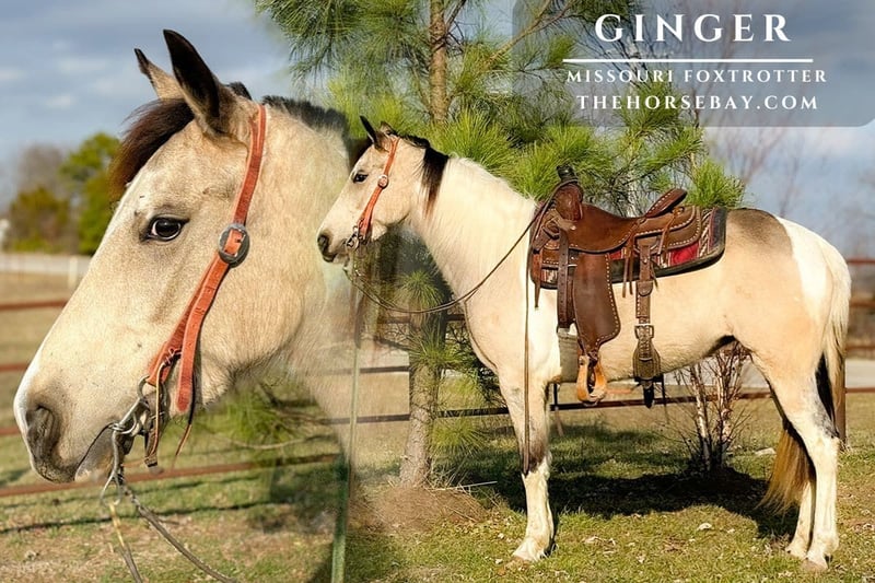 Meet Ginger, a beautiful 4-year-old, 14.3 hand buckskin Missouri Fox Trotter mare with a heart of gold and a ride like silk! She’s the perfect blend of gentle disposition and capable trail horse, ideal for riders seeking a safe, reliable, and fun companion. Ginger’s smooth, floating gait is incredibly comfortable for long hours on the trail, making every ride a pleasure, not a chore. At just 4 years old, she’s mature enough for seasoned riders but still young enough to build a lifetime of memories with. Her size offers a great stature without being too big. She’s proven on trails, crosses water, isn’t spooky of farm equipment or wildlife, and stands tied quietly at camps. Ginger is up-to-date on all care (shots, farrier, worming) and ready to find her forever home. Don’t miss the chance to own this lovely, safe, and versatile Missouri Fox Trotter!