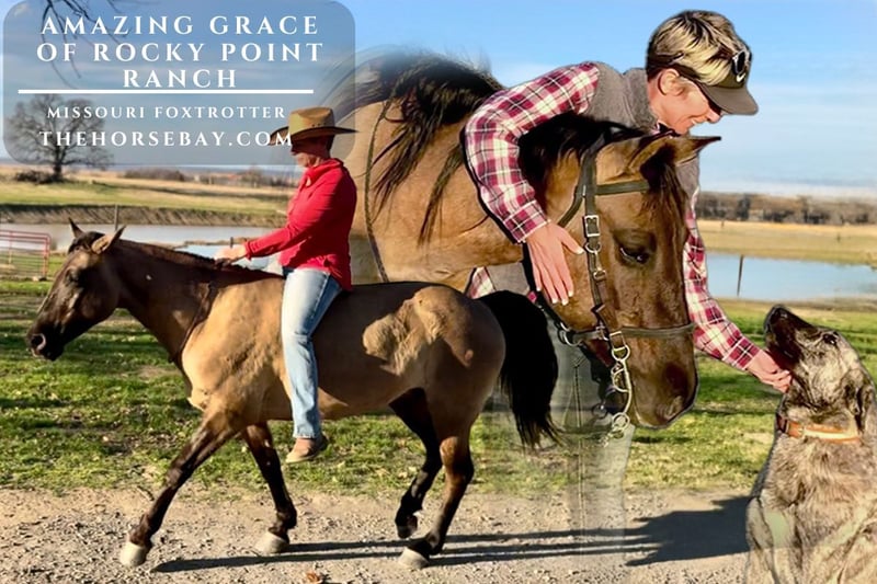 Amazing Grace of Rocky Point Ranch MFTHBA 20-105379 14.1 Hands 5 years old Grace is about as close to the perfect all-around trail horse partner as they come. One of the most important qualities I appreciate about Grace is that she is confidently observant of her surroundings and a thinker, not an overreactor. A good trail horse needs to be paying attention all the time to keep from stepping in a hole or off a ledge, etc. You will see in the video how Grace is very well trained, surefooted, highly intelligent, confident, willing, capable, respectful & trusting of her people partners. I have been helping write Grace’s life story from the day of her birth, when I looked into her big brown eyes. She was bred, born, imprinted, ground trained & started right here at Rocky Point Ranch. Grace comes from a long line of foundation Foxtrotters bred for a smooth, natural gait, a confident, trainable mind & a strong build. I have had the pleasure of developing a strong foundation of human trust & connection using Natural Horsemanship training methods. That’s why she not only trusts humans but actually enjoys being in your presence. If Grace can hear you calling her name, then she will literally come running from wherever she is, even leaving the other horses behind. She thrives off of your love and praise. With a little praise, she’ll do just about anything for you. She does the “pick me up,” so that comes in handy for a mounting block or, on the trail, for using a log or rock to give you a mounting boost. She will stand quietly until you ask her to move out. I ride her bareback from time to time, and at my age, I don’t jump as high as I used to, so the “pick me up” skill is vital. She has had a vast array of life experiences growing up with young children, as well as cattle, dogs, cats, chickens, pigs, goats & sheep. Tractors & 4 wheelers are just a normal part of her life. Grace has excellent ground manners and is softly responsive to cues. She will quietly walk beside you without getting in your space. Not only does she respectfully lead with a halter, but she also does so without one, as you will see in the videos. On cue, she will drop her head as low as you need to halter or bridle her, which is so useful for us short people or kids to reach her head. I can move her front end with just a gentle cluck and a touch on her shoulders. As shown in the video, Grace is very responsive to cues. I can move any part of her body with just a light touch and cluck. From the time Grace was a foal, not only did I teach her normal leading and ground manners, but I also taught her to lead by her tail. For saddling, Grace quietly stands even though I have to heave the saddle onto her back. Grace has grown up in our small herd of horses & mules. She gets along well with the other horses and tends to be in the middle of the pecking order. She will confidently ride out alone, in a group at the front, middle, or back, as she gets along well with other horses on the trail. In the fall of 2024, Grace delivered a beautiful Grulla stud colt that we named Dusty. She was a wonderful mother and allowed me and my young children to bond with him daily. In the video, there is a picture of him lying asleep in my young daughter’s lap while Grace peacefully watched over them. That pic brings back memories when Grace was a new filly, that same daughter used to snuggle with her. I want to thank Jerry Bontrager for his natural-horseman training style in putting the finishing touches on Grace. He did a great job of teaching her to be soft & responsive. She knows leg cues, how to slowly spin, stops on a dime, side passes to open gates, and stands quietly while you close the gate. She has a dreamy, natural, smooth gait on a relaxed, loose rein. We train our horses to smoothly gait with their neck & head in a more relaxed & level position, like a quarter horse. This more natural neck & head position is more functional & comfortable, giving the rider an unobstructed view of the trail ahead. Grace naturally & smoothly gaits even bareback with just a neck rope. For the record, she has never bucked, had a runaway, kicked, or bit anyone. I hope you understand that Grace has been truly loved and a part of our family. She is being offered only because it is for her best interest. In southeast Oklahoma, we have swarms of this little black fly that irritate our sheep & horses, but for Grace, they are especially irritating from about June to October. Grace has brains, beauty, athletic ability, a gentle disposition & a training foundation necessary for whatever your heart desires, whether it be competition events, ranch, trail, or pleasure riding. You are invited to come to our ranch to meet Amazing Grace for yourself and let her show off the amazing horse she is. She will steal your heart. Pouring so much time, attention & love into Grace has been one of the great joys of my life. I am excited to see her bring a lifetime of love & joy to a new family partner.