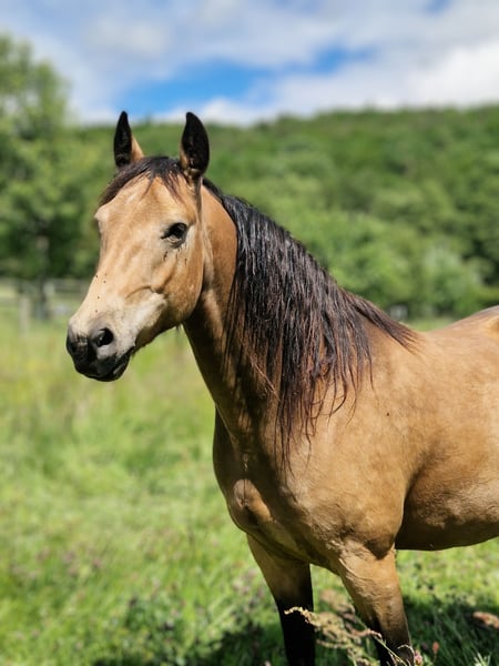 White Clouds Cisco Né le 12.06.2020 Missouri Foxtrotter avec papiers Buckskin avec un éclat bronze, Sunny Boy de l'optique et de la conformation parfaites, un rêve pour toutes les disciplines, un véritable costaud, sûr de ses pas, apte au terrain, aime être mené, mais se déplace dans toutes les positions, endurant, courageux, indépendant, robuste, stable, court de dos, volontaire, mais un peu paresseux sur le manège, orienté vers les humains, beau galop, se tient en premier à la clôture, curieux, joueur, drôle, audacieux, diligent, en bonne santé, apprend vite, professionnel en travail au sol, réactif et rapide. Formation de base avec l'entraîneur Horsemen Michael Rieser. Novembre/Décembre 2024 avec l'entraîneur de chevaux de gang Vierhaus (@ photos d'Ellen Vierhaus) Pour poursuivre la formation et le développement du Flatfoot Walk. Très équilibré dans un terrain difficile. Je l'ai acheté comme poulain, car il promettait de devenir comme son père un rassembleur naturel et a hérité de son excellent tempérament sûr de lui. C'est pourquoi j'ai acheté son demi-frère, qui sera beaucoup plus grand. CISCO a maintenant besoin d'un cavalier expérimenté, quelqu'un qui peut parfois s'imposer calmement et avec détermination, car il est encore au début de sa formation et n'a pas encore beaucoup travaillé, totalement non utilisé. Habitué à être en pâturage toute l'année avec un abri ouvert, groupe mixte, de rang élevé. Il a déjà participé à sa première petite randonnée et l'a maîtrisée avec brio, seul les dindons lui ont fait peur, mais il a ensuite suivi sans problème les grands Tennessee Walkers. Très bons sabots solides, jusqu'à présent en mode naturel. En bonne santé et plein d'énergie, naturellement vermifugé et vacciné.