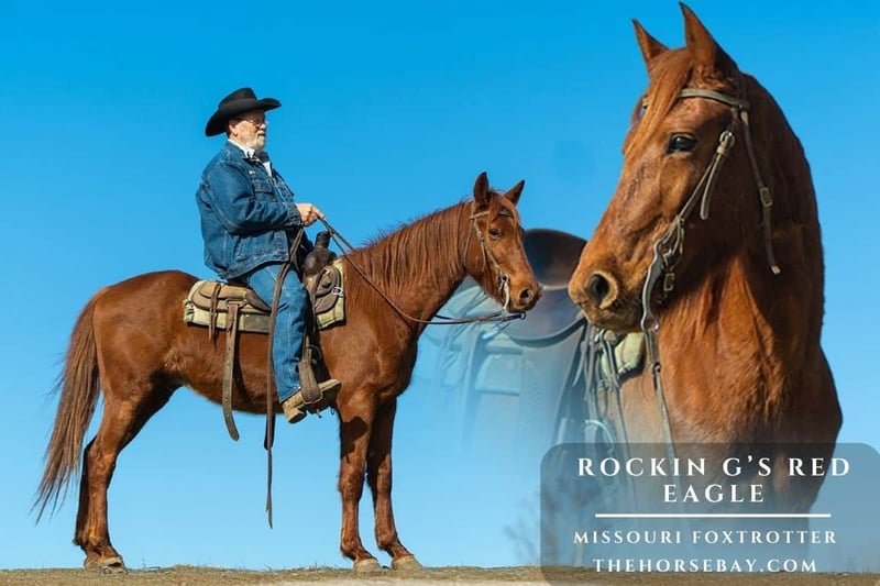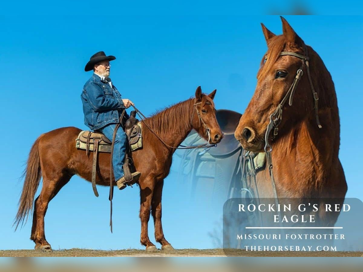 Rockin G’s Red Eagle is a registered 2021 Missouri Foxtrotter Gelding standing 15.1hh. Eagle is a great young trail horse that will be a good trail partner for a long time. He will go just about anywhere you want to go with no problem. He will cross water, logs, and rough terrain with ease and a smooth gait. He will stand to be saddled and mounted. He loads and hauls great. He is easy to catch and handle. Anyone can ride him who knows how. He will go slow, or he can move on down the trail so he can be ridden with any kind of horse. If you’re looking for a good trail partner, Eagle is your guy!