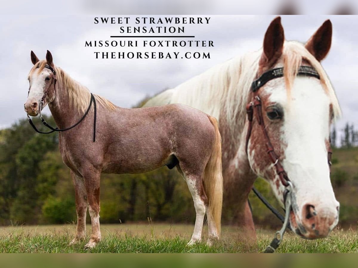Strawberry is a 6-year-old, DNA-d, registered Missouri Foxtrotting gelding. Strawberry was born, raised, and started right here on our farm in Marshfield, Missouri. He is a grandson of Southern Sunrise and a son of Southern Sunrise’s Hotshot (see photo). I was right there when he was born in my back pasture. Strawberry was first ridden by me at 79 years old. Knowing his calm disposition since he was born, and knowing his sire, grandsire, dam, etc. , I was pretty certain it was safe getting on him for his first ride. When you’re nearly 83 years old, you don’t stand up on a horse unless you trust him! While on the trail, you can drop the reins on Strawberry, and he will hold a nice, slow, steady walk in which you can ride with non-gaited horses. He will also consistently walk faster if you cue him to do so (just by squeezing your legs). He has a nice, even foxtrot and a lope (canter) that is a dream to ride! Strawberry also has a nice, fast rack that I prefer. Strawberry is easy to mount and dismount, standing perfectly still, patiently waiting for your cue to move forward or back. He loads quickly and easily in any horse trailer and backs out when asked. He loves his bath. He is very easy to catch! He loves babies, dogs, cats, and people, just to name a few! (Oh! And apples and other horse friends! He has always been with other horses and gets along with them well. Strawberry will be an eye-catcher on the trail with his beautiful color and conformation, his gentle, friendly demeanor, and just his all-around appearance! We strongly encourage people to call and come ride Strawberry while he is listed on visit our website We look forward to meeting you and answering any questions you may have about Strawberry.