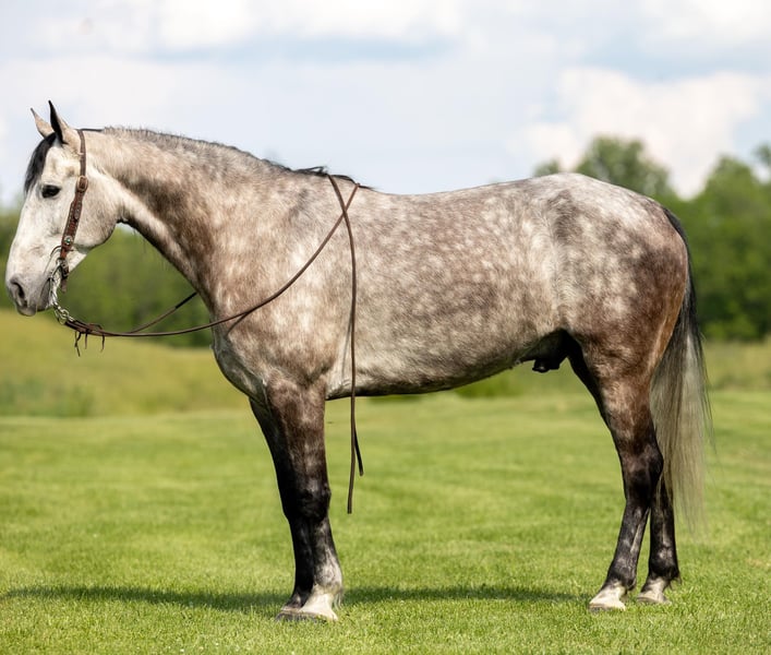 ONLINE AUCTION Place your bids at www.PlatinumEquineAuction.com Starting Bid $3500 Auction ends June 23rd, 2024 Need a new saddle? Check out White Rock Saddles on our website or Facebook! If you are looking for a trail horse on Saturday and then a horse to put on the rail Saturday night to win you some blue ribbons, look no further! Let me introduce you to Nelly. Nelly is a 6 year old DAPPLED GREY gelding. He stands 15.3 hands tall and will weigh 1100 lbs. Nelly has been used on the trails and in the show ring. He has a beautiful head set and will move out with a lot of action and style! Through the trails, Nelly will cross all obstacles with confidence rather that be trees, stumps, hills or water when asked. He is brave, sure footed and confident. He has been ridden in local fun shows and leaving with many blue ribbons! Nelly is a very personable horse! He will meet you at the gate every time! He is very gentle and doesn’t have a mean bone in his body! He stands to be saddled, bridled and groomed! He will park out on command with a tap on his shoulder! Stands for mounting and dismounting with or without a mounting block! If you’re wanting a lot of complements on the trail or a bunch of ribbons to hang on the wall, Nelly is your winner! For any other information please contact PR Quality Horses Colton 606-748-9009 or Haley 859-475-2621. ONLINE AUCTION Place your bids at www.PlatinumEquineAuction.com Starting Bid $3500 Auction ends June 23rd, 2024 Need a new saddle? Check out White Rock Saddles on our website or Facebook!