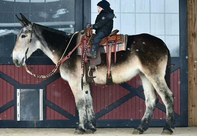 "AVAILABLE ON ONLINE HORSE AUCTION AT www DOT PlatinumEquineAuction DOT com BIDDING OPEN NOW thru SUNDAY | MARCH 1ST! *Final price will be determined on auction site* CONSIGNOR CONTACT INFO: Marlis Farms 814-777-0607 LOCATION: Rebersburg, PA Eeyore, as we call her, is an 11 Yr Old 16.0HH Grey Molly Mule. She is well broke to ride and drive. She is a quiet mule that is easy to ride and be around. Eeyore is a great trail mule and goes over logs and through the water. She will go wherever you point her with no hesitation. She rides the same every day. She has a smooth walk, trot, and slow lope. She is gentle and loves attention. She is safe for all ages. We have taken her downtown and she does not mind the traffic or the commotion. Eeyore is a good minded mule and does not get excited easily. She does well inside or turned out with a mixed herd. She rides out alone or in a group. We have used Eeyore to push cattle and check fences here on the farm. Eeyore stands to be tacked, mounted, groomed, and for the farrier. She sells sane, sound, and ready to move into her forever home. For more information call Mark 814-777-0607. Calls Only. We can help arrange shipping anywhere!!