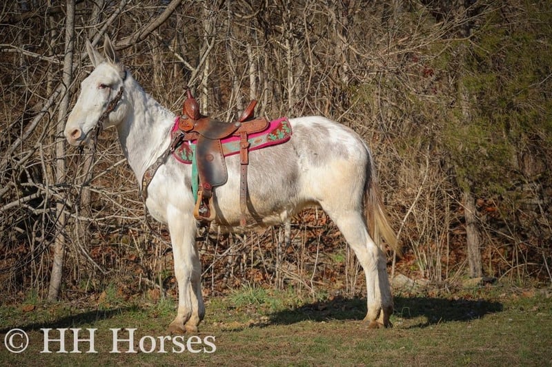 ONLINE AUCTION Place your bids at www.PlatinumEquineAuction.com Starting Bid $3500 Auction ends January 26th, 2025 Need a new saddle? Check out White Rock Saddles on our website or Facebook! This is “STARDUST”, a FLASHY, FUN, GENTLE, AND QUIET NATURED Blue Roan Paint Molly Mule that has been ridden by novice and beginner riders. This mule has been in the mountains and ridden by a gentleman in his 70’s. She has no buck, no hump, and no tricks or surprises. She is an easy mule to have around that handles her ears, all four feet, and she has excellent ground manners. She stands tied quietly, loads, bathes, and hauls with no issues. She stands 14.2 hands tall and is 11 years old. She has been through deep water, on rough and rocky ground, and on the main roads. She has been on organized rides with lots of other horses, mules, wagons, and commotion and handled it all fine. She also rides out alone with confidence and enjoys to trail ride. She will not go any faster than what you ask of her, she is easy to stop, and she stands to mount. She has been ridden double, bareback, and also in just a halter and lead rope. If you need a quiet gentle mule that is a handy size to get on and off of, don’t miss out. She’s pure and honest. For more info or to make a Buy It Now Offer call HH Horses Erin 304-238-4155 Located in Flemingsburg, KY. ONLINE AUCTION Place your bids at www.PlatinumEquineAuction.com Starting Bid $3500 Auction ends January 26th, 2025 Need a new saddle? Check out White Rock Saddles on our website or Facebook!