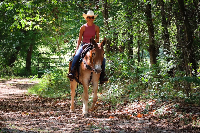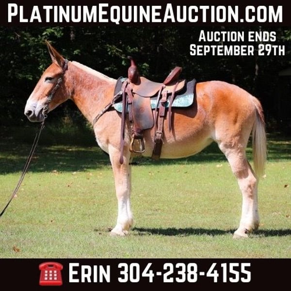 ONLINE AUCTION Place your bids at www.PlatinumEquineAuction.com Starting Bid $3500 Auction ends September 29th, 2024 Need a new saddle? Check out White Rock Saddles on our website or Facebook! This is June, a FAMILY, YOUTH, AND BEGINNER FRIENDLY SORREL MOLLY MULE. This mule is broke to work, ride, and she will hook double or single. She is 15.1 hands tall and 11 years old. She has been ridden by children to school and has been driven on the main roads in a top buggy, cart, and wagon. She is traffic safe and not spooky of fast traffic, tractors, four wheelers, or side by sides. She is quiet and very easy to catch. She stands to hook, harness, tack, mount, and groom. She stands tied, loads, bathes, and hauls with no fuss at all. This mule has been in the woods and used to skid logs, she has pulled the manure spreader, all hay machinery, and the big hay wagons. She is as honest as you get. She is very easy to ride and will lope off quietly with no hump and no buck. She is easy to stop, she handles both ears, and picks up all four feet. She will cross fast rushing water with confidence and rides out alone bravely. She will also ride in a group and doesn’t care if she is in the lead or bringing up the rear. She is fine with dogs trailing her heels. This mule is safe, gentle, and has lots of experience under saddle and under harness. She is B-R-O-K-E!! Don’t miss out on the hard to find kind of mule. Her new owners will appreciate how docile, civilized, and patient she really is. She is Located in Flemingsburg, KY. Contact HH Horses Erin 304-238-4155 with any questions. ONLINE AUCTION Place your bids at www.PlatinumEquineAuction.com Starting Bid $3500 Auction ends September 29th, 2024 Need a new saddle? Check out White Rock Saddles on our website or Facebook!