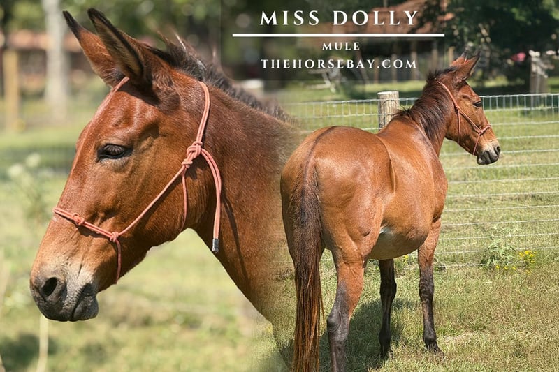 Miss Dolly ist eine äußerst liebevolle, 14 Hand große, wunderschöne fuchsfarbene Dun-Molly. Sie besitzt eine kräftige Konstitution und eine klare, gut definierte Kontur. Aus jedem Blickwinkel, zu jeder Jahreszeit, ist sie einfach umwerfend schön. Miss Dolly ist leicht zu fassen und im Umgang sehr freundlich. Sie ist so süß wie Zucker und stets bemüht, zu gefallen. Sie ist mit allen vier Beinen sowie beiden Ohren gut vertraut und lässt sich problemlos haltern und anreiten. Dolly steht auch ruhig und geduldig für das Pflege- und Sattelzeug. Sie kann allein oder in der Gruppe geritten werden, ohne Probleme. Sie verfügt über eine angenehme, weiche Halsreininge und einen leichten Abstopper. Ihr bevorzugter Gang ist ein gemütlicher Trailwalk, aber sie beherrscht auch einen weichen Jog, Tölt und einen schönen, geschmeidigen kurzen Longe. Als selbstbewusster Trail-Muli meistert sie jede Strecke, egal wie rau oder steil das Gelände ist. Sie geht langsam und gelassen durch unebenes Gelände und bergab. Miss Dolly ist für Kinder und Erwachsene jeden Alters geeignet. Sie ist erfahren, zuverlässig und bereit für den nächsten Ausritt. Sie baut schnell Vertrauen auf; sie verbindet sich mit jedem, der ihr Zeit schenkt. Sie liebt deutsche Pferdemuffins und Aufmerksamkeit. Mit einer Mule wie Dolly im Stall oder unter dem Sattel ist jeder Tag ein guter Tag.