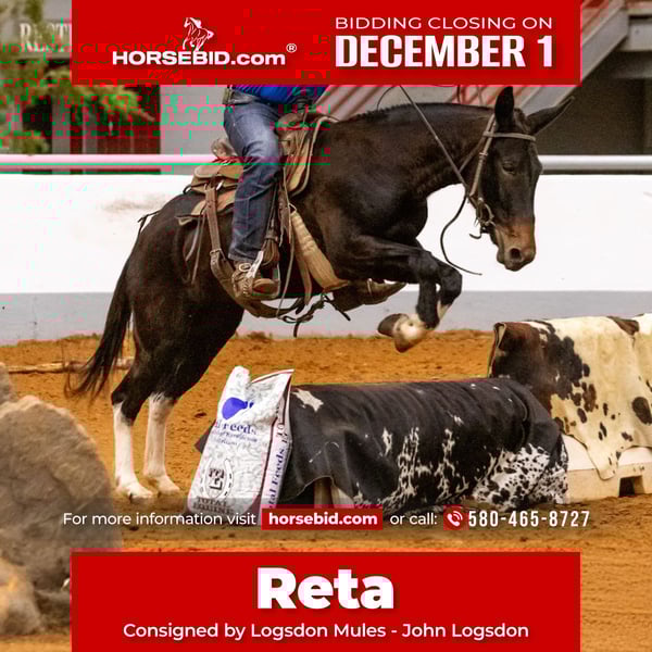 ⚜️ 𝓽𝓱𝓮 𝐇𝐨𝐫𝐬𝐞𝐦𝐚𝐧'𝐬 𝓢𝓱𝓸𝔀𝓬𝓪𝓼𝓮⚜️ Happening now thru MONDAY | DECEMBER 1st - Available EXCLUSIVELY on HorseBid's website! For more details and to register visit: www.Horsebid.com CONSIGNOR CONTACT: Logsdon Mules - John Logsdon 580-465-8727 LOCATION: Fittstown, OK BREED: Mule REGISTERED: No COLOR: Black with 4 white legs HEIGHT: 14.3 AGE: 4 GENDER: Molly Mule Meet Reta, a stunning 4-year-old Molly mule with a proven track record and a heart of gold. With extensive trail riding experience in Oklahoma and Colorado, Reta has developed into a reliable and athletic companion. This beautiful young mule stands 14.3 hands tall and boasts impressive credentials: - *Trail Ridden*: Comfortable and sure-footed on varied terrain in OK and CO - *Ponied Colts*: Stays quiet under pressure - *EXCA Reserve Champion*: Open Mule Division - showcasing her talent and willingness Reta’s disposition, looks and ability are sure to turn heads wherever she goes. Whether you're looking for a trail partner, a ranch mule that can be shown, or just a trusted companion, Reta fits the bill. If you're seeking a young, talented, and versatile mule with a bright future, look no further. Contact us to learn more about Reta and arrange to come and meet her!