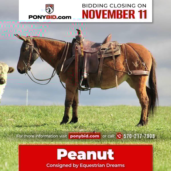 𝓽𝓱𝓮 𝐑𝐈𝐃𝐄𝐑'𝐒 𝓒𝓱𝓸𝓲𝓬𝓮 🐴 𝐏𝐎𝐍𝐘 𝐄𝐃𝐈𝐓𝐈𝐎𝐍 🐴 Happening now thru TUESDAY | NOVEMBER 11th - Available EXCLUSIVELY on Ponybid's website! For more details and to register visit: www.Ponybid.com CONSIGNOR CONTACT: Equestrian Dreams 570-217-7908 LOCATION: Rebersburg, PA BREED: Mule REGISTERED: No COLOR: Red dun HEIGHT: 13.2 AGE: 8 GENDER: Molly Mule 🌟🌟 Peanut 🌟🌟 Wow! What a pretty mule! Peanut is not your typical mule, this girl loves attention and will be waiting for you in the morning, she will let you rub her all over and is not touchy at all around her ears, she loves to be groomed and rubbed on , Peanut is well broke broke to ride and has a Smooth walk-trot-canter that is very easy to sit on , absolutely no buck or rear with Peanut and she loves to trail ride and has been hauled to state parks for trail rides and also been to fun shows , she loads and hauls great! She has been ridden around the farm and is not spooky to farm equipment or loud traffic Over the past year, Peanut has been ridden by both adults and children. She has experience in Ranch, Halter, and Contest classes, and with more finishing, she has the potential to be a high-end performance or show mule. She rides out alone or in a group, has been harnessed, and is broke to a pack saddle. Peanut is eager to please and a quick learner. Peanut sells 100% sound and healthy and requires no maintenance, she can be barefoot or have shoes she stands well for the farrier or vet She is up-to-date on farrier and dewormer and has a current coggins and health certificate If You have any questions please feel free to call Sam 814-810-7918 We are happy to assist arranging transportation anywhere in the US