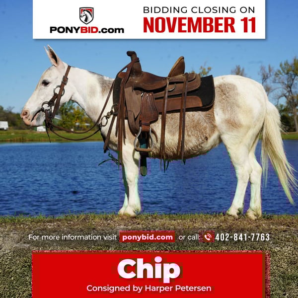 𝓽𝓱𝓮 𝐑𝐈𝐃𝐄𝐑'𝐒 𝓒𝓱𝓸𝓲𝓬𝓮 🐴 𝐏𝐎𝐍𝐘 𝐄𝐃𝐈𝐓𝐈𝐎𝐍 🐴 Happening now thru TUESDAY | NOVEMBER 11th - Available EXCLUSIVELY on Ponybid's website! For more details and to register visit: www.Ponybid.com CONSIGNOR CONTACT: Harper Petersen 402-841-7763 LOCATION: Corsica SD BREED: Mini Mule REGISTERED: No COLOR: Gray Paint HEIGHT: 32" AGE: 7 GENDER: Mare Chip is a super cute 7 year old 32 inch mini Molly mule. She has been rode all over super easy and fun to do ride, she is safe and broke the very best and also started driving. Call or text 402-841-7763