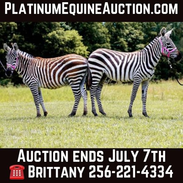 ONLINE AUCTION Place your bids at www.PlatinumEquineAuction.com Starting Bid $3500 Auction ends July 7th, 2024 Need a new saddle? Check out White Rock Saddles on our website or Facebook! You are bidding on the pair for 1 price (the final bid gets both zebras). Smiley and Stripes! Two male zebras that are a year and a half old! They were bottle babies! Super sweet, gentle, easy to handle, and super easy to catch! They have been around horses, ponies, goats, cattle, dogs,cats and kids! They love treats and love to be loved on! Stands for bath time! Easy to lead and have been played with by an 8 year old daily! And the whole neighborhood! They have also been used for photo shoots! Located in Mt. Hope, AL. Contact Brittany Little 256-221-4334. ONLINE AUCTION Place your bids at www.PlatinumEquineAuction.com Starting Bid $3500 Auction ends July 7th, 2024 Need a new saddle? Check out White Rock Saddles on our website or Facebook!