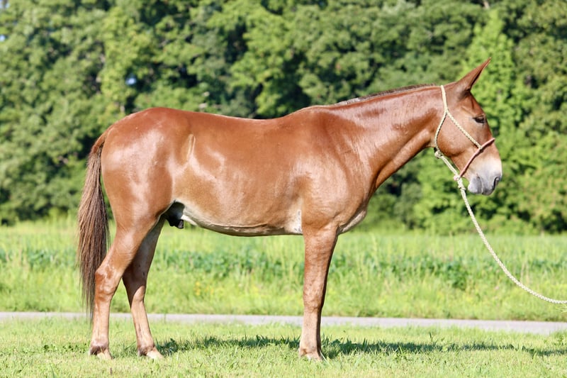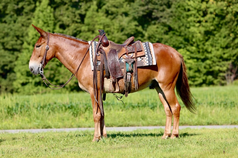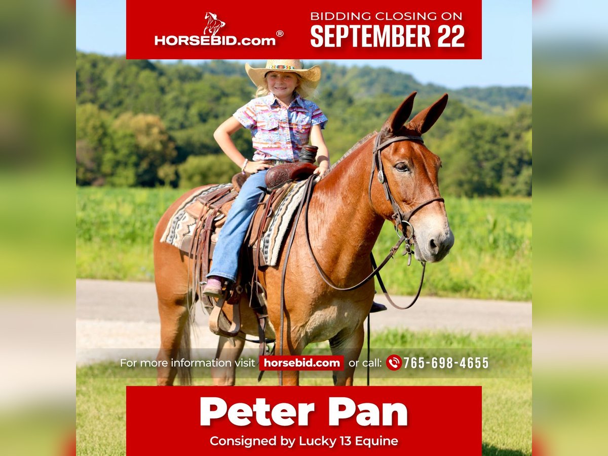 🍁𝒕𝒉𝒆 𝐅𝐀𝐋𝐋 𝑺𝒑𝒆𝒄𝒕𝒂𝒄𝒖𝒍𝒂𝒓🍁 Happening now thru MONDAY | SEPTEMBER 22nd - Available EXCLUSIVELY on HorseBid's website! For more details and to register visit: www.Horsebid.com CONSIGNOR CONTACT: Lucky 13 Equine 765-698-4655 LOCATION: Mount Vernon, Kentucky BREED: Mule REGISTERED: No REGISTERED NAME: Peter Pan COLOR: Sorrel HEIGHT: 14.3 AGE: 9 GENDER: John Mule 🌟Peter Pan is a 9-year-old, 14.2-hand John mule with all the looks, temperament, and training to stand out anywhere. He’s an experienced and versatile mount who is just as enjoyable on the trail as he is in the arena or at work. Easy to catch and eager for attention, Peter Pan has a quiet, people-oriented nature and a million dollar personality. He stands patiently for brushing, clipping, farrier work, and even having his ears handled, and he is calm and trustworthy around children, dogs, and even little critters. Peter Pan is 100% sound in every way. Under saddle, Peter Pan walks, trots, and canters smoothly in both directions, stops and backs willingly, and side-passes to open and close gates with ease. He works equally well alone or in company without becoming barn-sour or attached to other animals. This mule has been extensively trail-ridden, including overnight camping trips from here to Montana, and he handles new environments and varied terrain like a seasoned pro. Peter Pan has also been shown at local fun shows in multiple classes and used at exotic animal sales to push, pen, and sort a wide variety of animals from Brahamas to ostrich’s. This guy has spent many nights coon hunting, he tracks easily with dogs, stands good for gunfire, packs out game, and you can even pony your dogs back to the truck. Peter Pan is the type you can leave off and when you’re ready he’ll ride off just like you rode him yesterday. He is also not the typical John mule that’s going to aggravate anything he is turned out with. Whether you’re looking for a sure-footed trail partner, a handy ranch mule, or a safe, versatile mount for the family, Peter Pan combines training, temperament, and experience in one stout, eye-catching package. You do not have to have mule experience to get along with Peter Pan! Our boy is truly is NOT your typical mule and will be a blessing to any family.