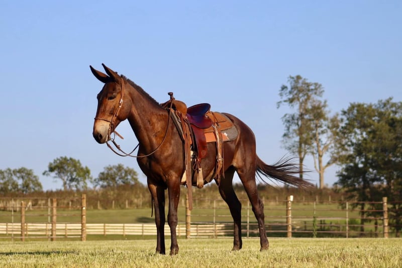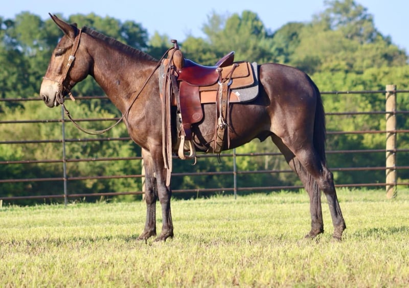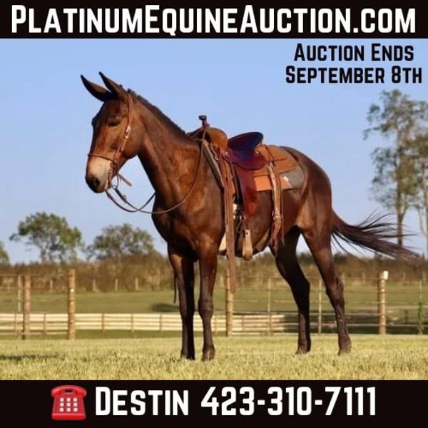 ONLINE AUCTION Place your bids at www.PlatinumEquineAuction.com Starting Bid $3500 Auction ends September 8th, 2024 Need a new saddle? Check out White Rock Saddles on our website or Facebook! Frankie is an 11 year old, 15 hand gaited John mule. If you are a trail blazing, tough trail, all day type of rider, you will love Frankie! We have had so much fun with Frankie on the trails. If you point his nose, he is sure to go and make you feel safe doing it! He is extremely brave, but also careful. He knows how to really rock back and slide down steep banks and hills. Give him his head and he will crawl back up them too. Crosses creeks. Goes through brush. He rides out alone or with the large group. He has a consistent ground covering gear at 8 mph. He’s been in the west and does well in that climate. We’ve taken him to the county fair shows all summer in the gaited mule classes and he has placed well. Frankie is traffic safe. We’ve jumped him up onto the flatbed trailers and driven him around. He jumps obstacles if you like. You name it, he is game for it! For more information, call Brookside Horse Sales Destin 423-310-7111. ONLINE AUCTION Place your bids at www.PlatinumEquineAuction.com Starting Bid $3500 Auction ends September 8th, 2024 Need a new saddle? Check out White Rock Saddles on our website or Facebook!