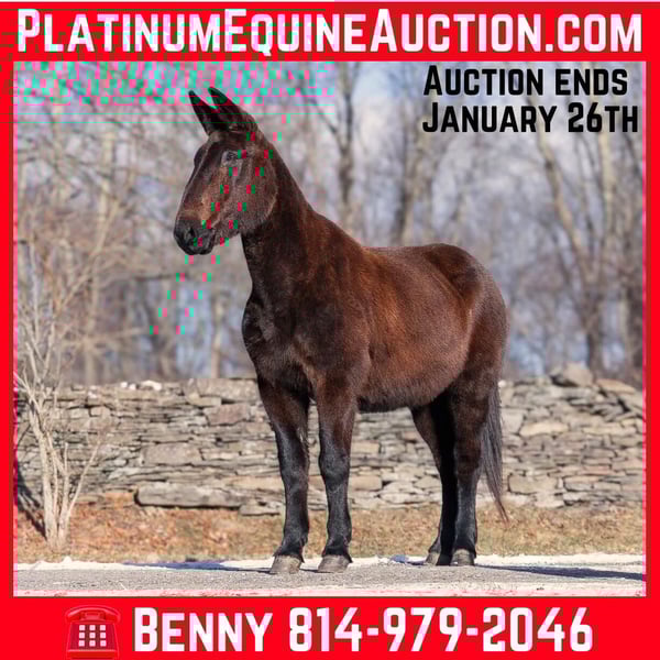 ONLINE AUCTION Place your bids at www.PlatinumEquineAuction.com Starting Bid $3500 Auction ends January 26th, 2025 Need a new saddle? Check out White Rock Saddles on our website or Facebook! Ariat is a stout built black john/gelding mule that is standing 15.3hh and he is a 13 years old. Ariat is just what everyone needs, he has years of experience so he is safe and well seasoned which makes him dependable! Ariat is a do it all kind of mule whether you want to ride, drive or pack… he does it all! He can go out and hit the trails and just cruise along slow and easy. He rides on a loose rein and is never in a hurry. He has a smooth jog, a nice easy to set lope, a good stop, turns around easily and backs! He has been exposed to all kinds of wildlife. He will go up or down steep slopes, across deep creeks, over downed trees, and over all types of rough terrain while still being sure footed. He has been ridden through town and is safe in traffic is not spooky. Ariat has been ridden around the ranch and has pushed cows. Ariat will go under harness and drives the very best, tight spaces are no issue for him and he will hitch single or double either one. Ariat will also pack if the occasion arises, he can handle that as well. Ariat is located in Everett, PA. Contact Benny Hall 814-979-2046 with any questions or to make a Buy It Now Offer. Thanks!