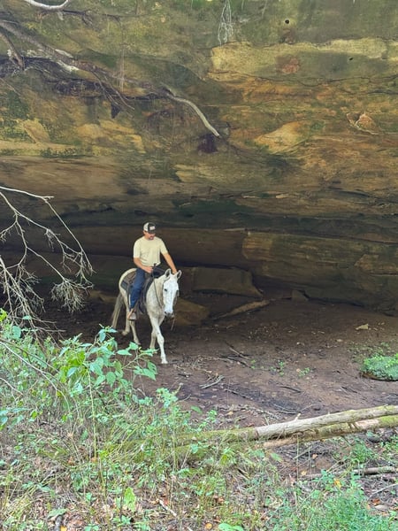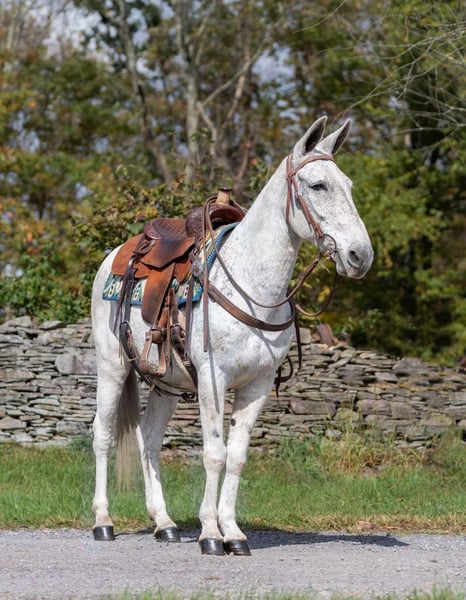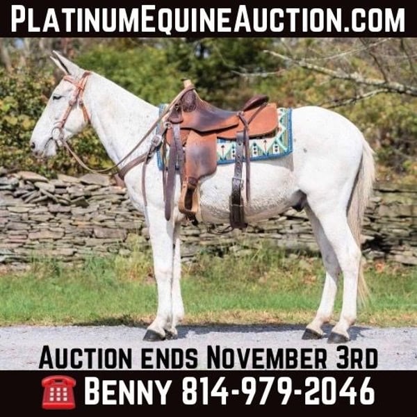 ONLINE AUCTION Place your bids at www.PlatinumEquineAuction.com Starting Bid $3500 Auction ends November 3rd, 2024 Need a new saddle? Check out White Rock Saddles on our website or Facebook! Mr. BoJangles… If you’re looking for a John mule the whole family can enjoy then meet Mr. Bojangles or “Jangles” as we call him! Jangles is a 12 year old John mule that stands 14.1hh and is bump and blemish free. If you need a trail boss 7 days week he’s your guy. Only ride on weekends when it’s sunny and 75°? He does just fine sitting and then being a weekend warrior too! Jangles is easy to live with and requires no special care/diet or maintenance. He is barefoot sound and happy! Jangles will live in a stall or turned out just as peacefully. He gets along with other mules and horses and has been around dogs, pigs, cows and goats. He will ride around the arena walk, trot and lope as well as takes correct leads and a jump. He is really soft in the mouth through his turns and will stop when you say whoa he will even collect into contact. He has been trail ridden up and down the east coast and through the steep valleys and rock formations of Hocking Hills State Park in Ohio. This mule is a point and shoot trail boss, he will negotiate any terrain and go wherever you point. He is fine with water, logs, 2 ways traffic, passing hikers and bikers as well as any wildlife you’d expect to bump into out on the trail. I would easily let a kid trail ride all day long on him as he isn’t at all spooky or naughty and has no tricks up his sleeve. Jangles is one the most gentle trail mules we have ever had. I also love that he can lope circles in the arena while carrying a flag or drag a tarp, pull a sled or even take him coon hunting at night! He’s your one stop shop for “good mule” Jangles is easy to trail loads and stays tied on a single or cross tie, good for grooming and saddling and takes the bit nicely. He stands to be mounted from the ground or a mounting block. He sells sound with no previous medical history and no vices. All prospective buyers are welcome to have any type of pre purchase vet exam done at their expense. If you need assistance in arranging hauling please don’t hesitate to ask, we would be happy to share a list of haulers we have used and recommend. Located in Everett, PA. Call Benny Hall 814-979-2046 with any questions. ONLINE AUCTION Place your bids at www.PlatinumEquineAuction.com Starting Bid $3500 Auction ends November 3rd, 2024 Need a new saddle? Check out White Rock Saddles on our website or Facebook!