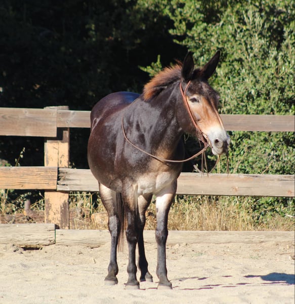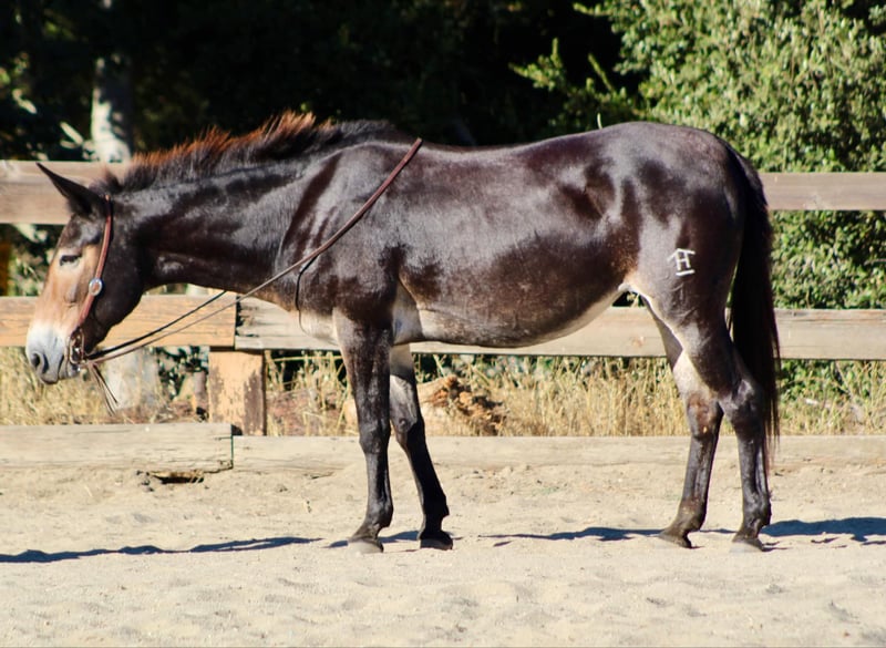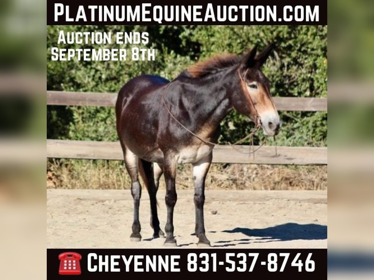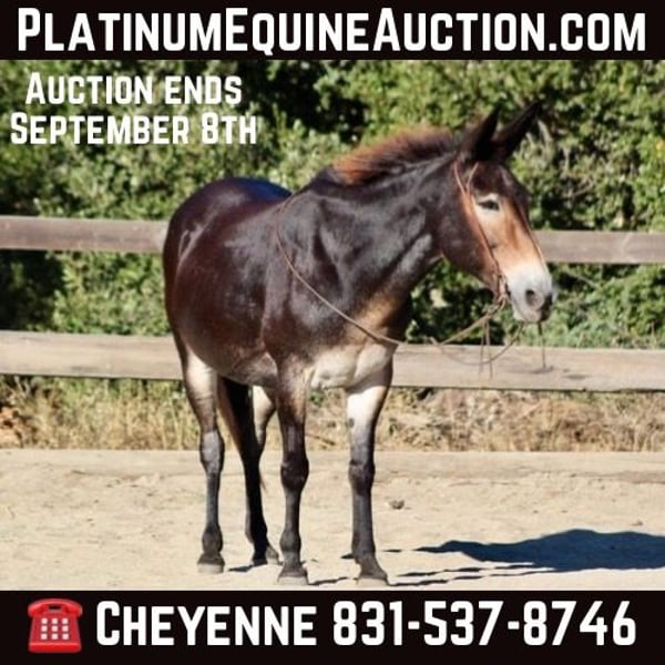 ONLINE AUCTION Place your bids at www.PlatinumEquineAuction.com Starting Bid $3500 Auction ends September 8th, 2024 Need a new saddle? Check out White Rock Saddles on our website or Facebook! Birdie is a doll faced brown Molly mule standing 14.2 HH. Birdie is the epitome of safe! This sweet little mule is the prime age of 12 years old and has seen more miles than your Chevy pick up! Birdie has been used on a dude string in the high sierras and has packed everyone from beginners to grandmas! She is used to crossing squeaky bridges, rushing water, and never blinks an eye at critters out in nature! Birdie is as sweet as can be and loves attention. You can catch her in a 50 acre lot just as easy as a box stall! She has no “mareish” attitude and gets along with most every horse or animal she’s been out with. She doesn’t mind you touching her ears, face or all over her legs and body! She has great feet, doesn’t require shoes, and picks them all up with no issues. Absolutely no kicking, spooking, or funny business ever! She will stand quietly at the hitching post while being saddled and loads up in any trailer effortlessly. Birdie can sit for days, or months and never change her sweet demeanor. In the arena she is just as calm and relaxed as she is put on trail. She is a slower paced mule but will lope nicely both ways and has a great stop! She neck reins lightly and responses to ques softly. We have rode her all over the city streets, down beaches, and you will never get her to bock at anything. She has been exposed to practically everything and truly is safe for anyone! For more info please contact Cheyenne at 831-537-8746. She is located in Bitterwater, CA. ONLINE AUCTION Place your bids at www.PlatinumEquineAuction.com Starting Bid $3500 Auction ends September 8th, 2024 Need a new saddle? Check out White Rock Saddles on our website or Facebook!