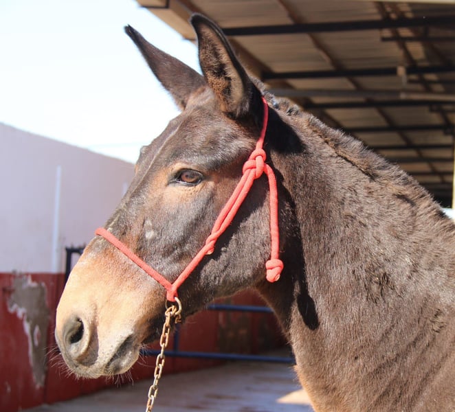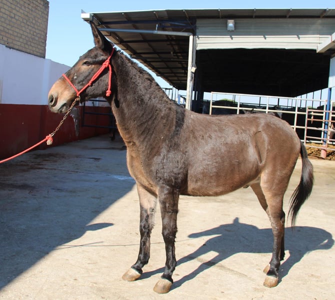 All of our noble mules have been ridden and are safe for traffic, not skittish, and regularly participate in Romerías and Ferias (Spanish festivals), so they are accustomed to a certain level of noise and commotion. The handsome one allows the rider to sit comfortably, is very well-behaved, and has a lovable character, making him ideal for relaxed rides. Upon request, he can stay with us for further training. International transportation can be arranged.